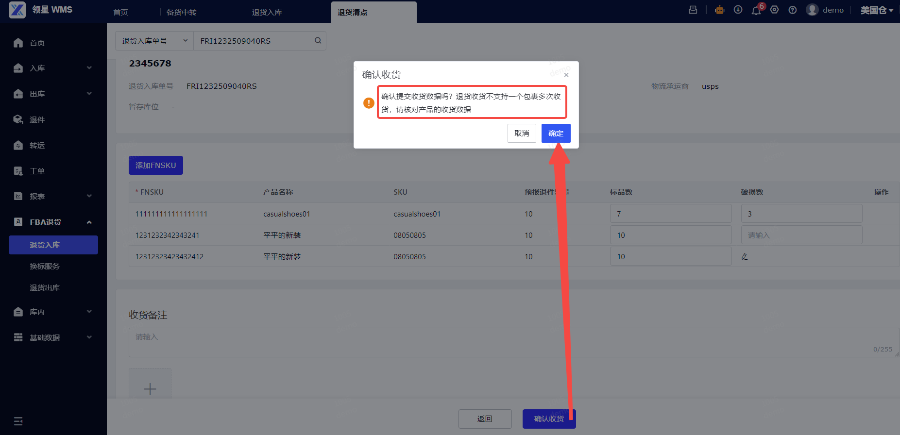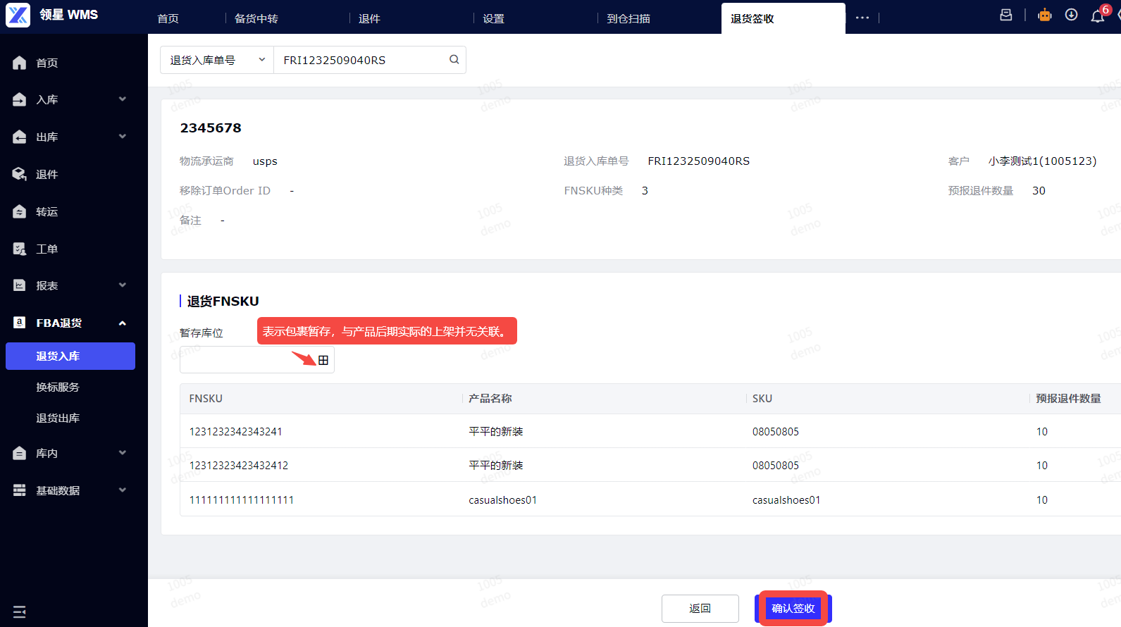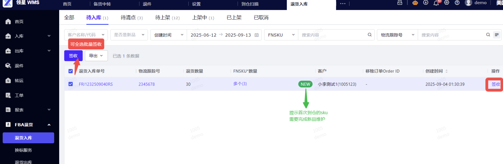 (1)退货签收: 进入WMS-FBA退货-入库板块,[待入库] 状态,点击签收。