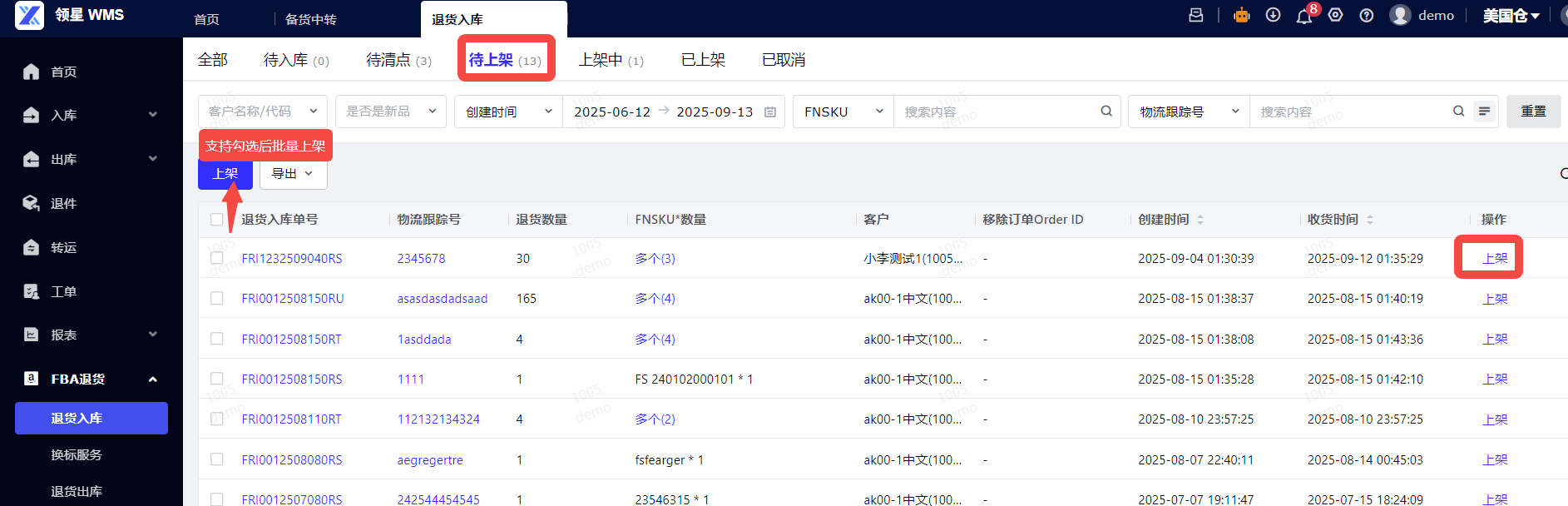 (3)退货上架:签收后到 [待上架] 状态,点击上架。