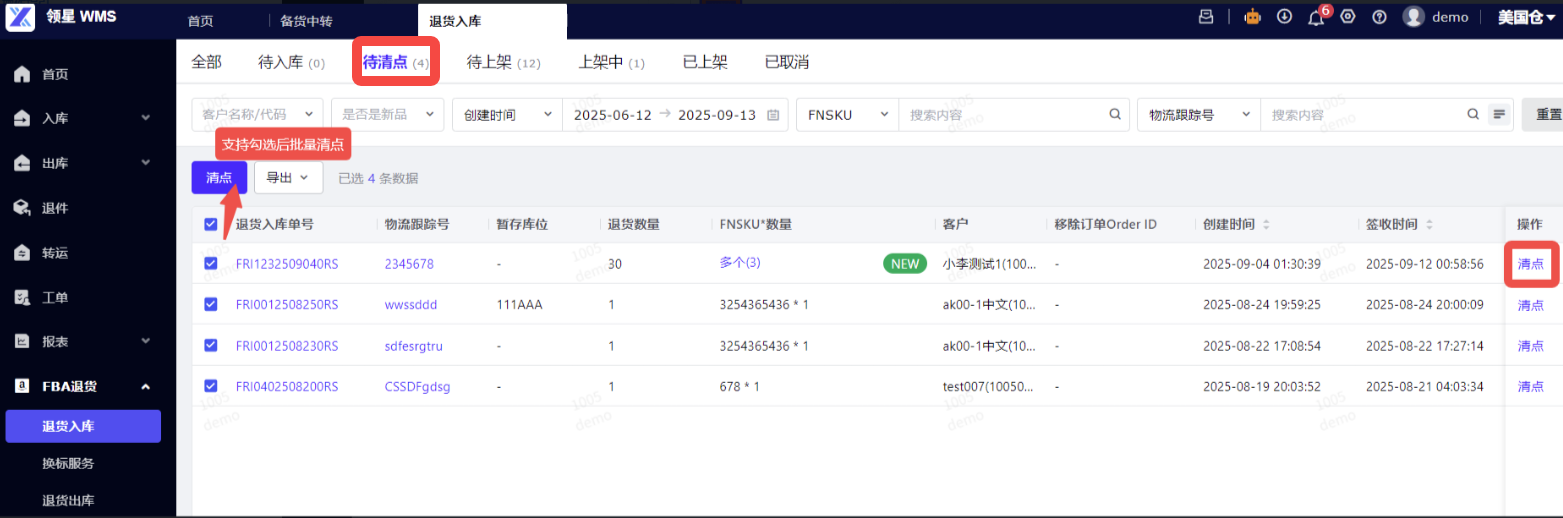 (2)退货清点:签收后到 [待清点] 状态,点击清点。