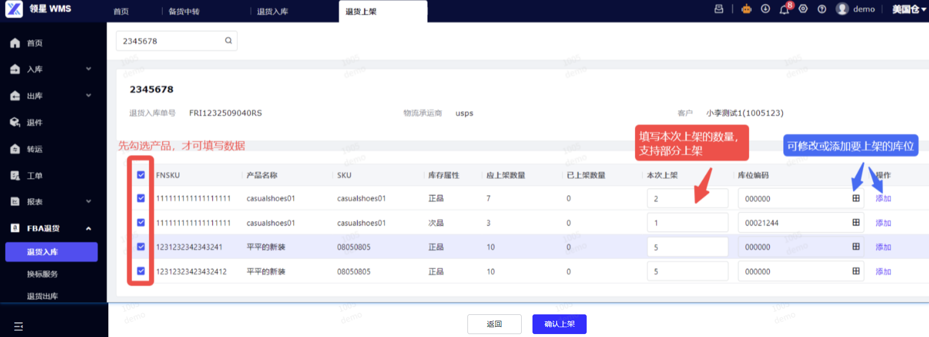 如果一个FNSKU要上架到多个库位,可点击添加,并选择库位。确认无误后点击确认上架。
