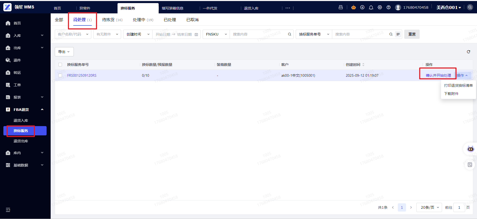● 待处理:客户在OMS新建换标服务单并提交,表示退货换标单已成功提交至仓库系统,点击“确认并开始处理”,操作成功后即为待拣货状态,可打印退货换标清单和下载附件。