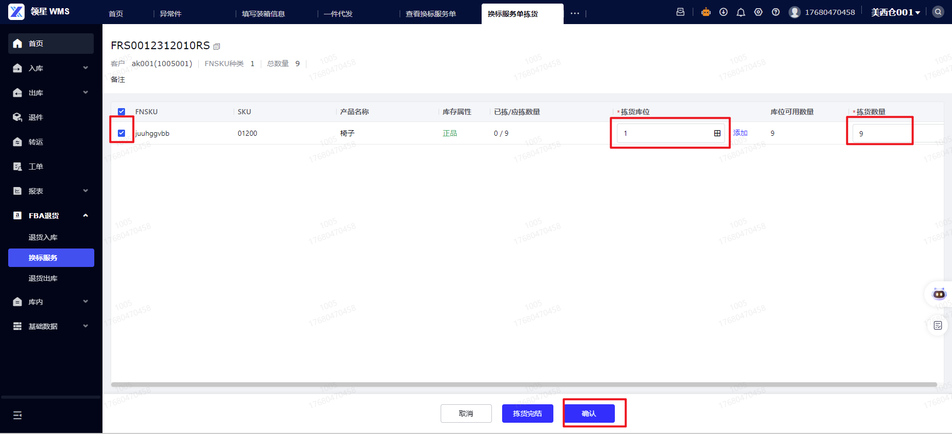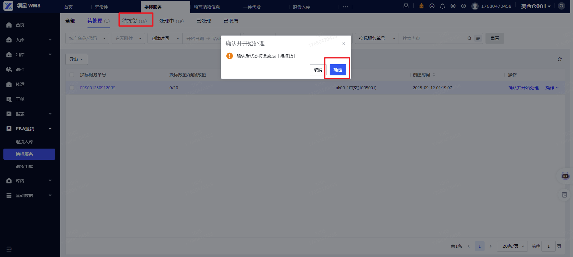 (2)处理FBA换标服务单:导航至换标服务菜单,待处理状态点击确认并开始处理按钮,点击确认,单据会流转到待拣货状态。同时可打印退货换标清单和下载单据的附件。