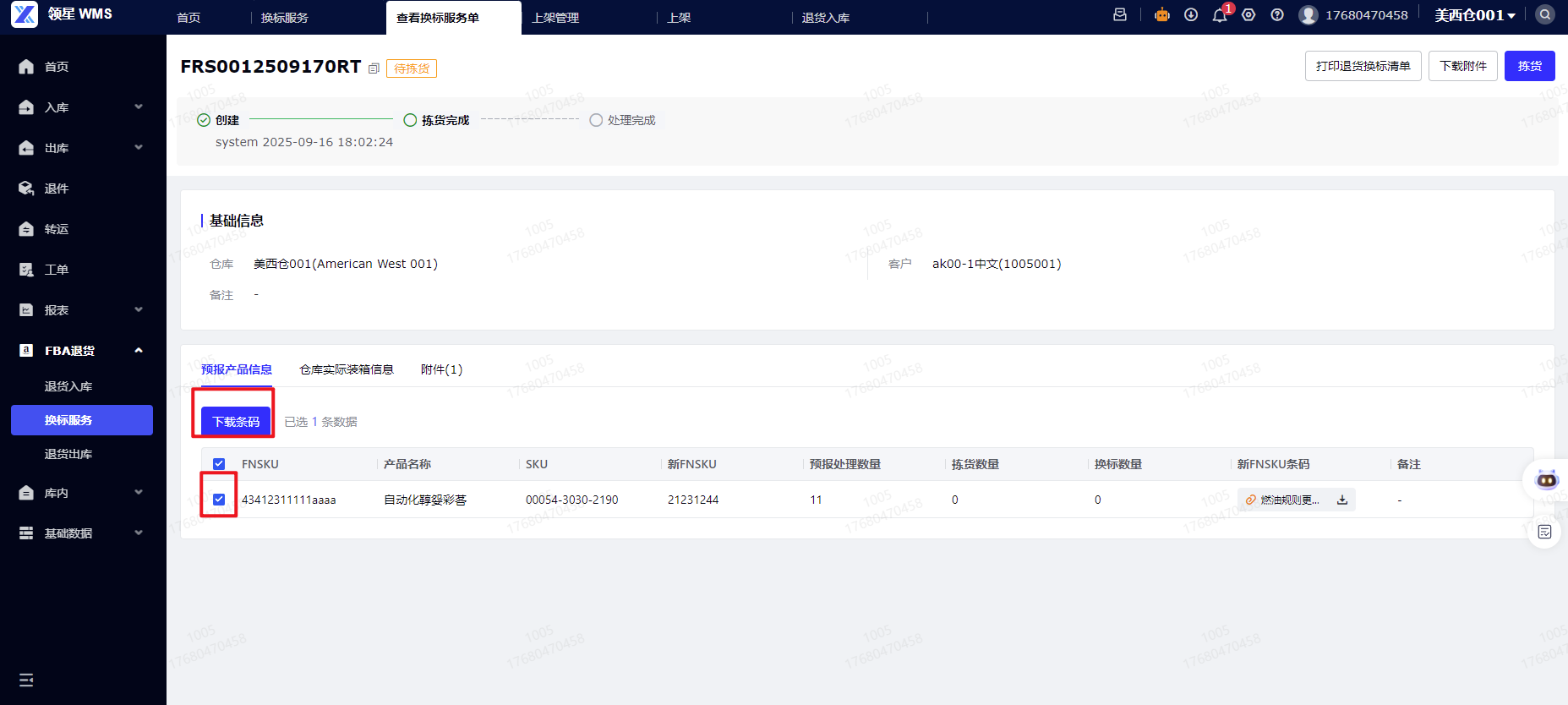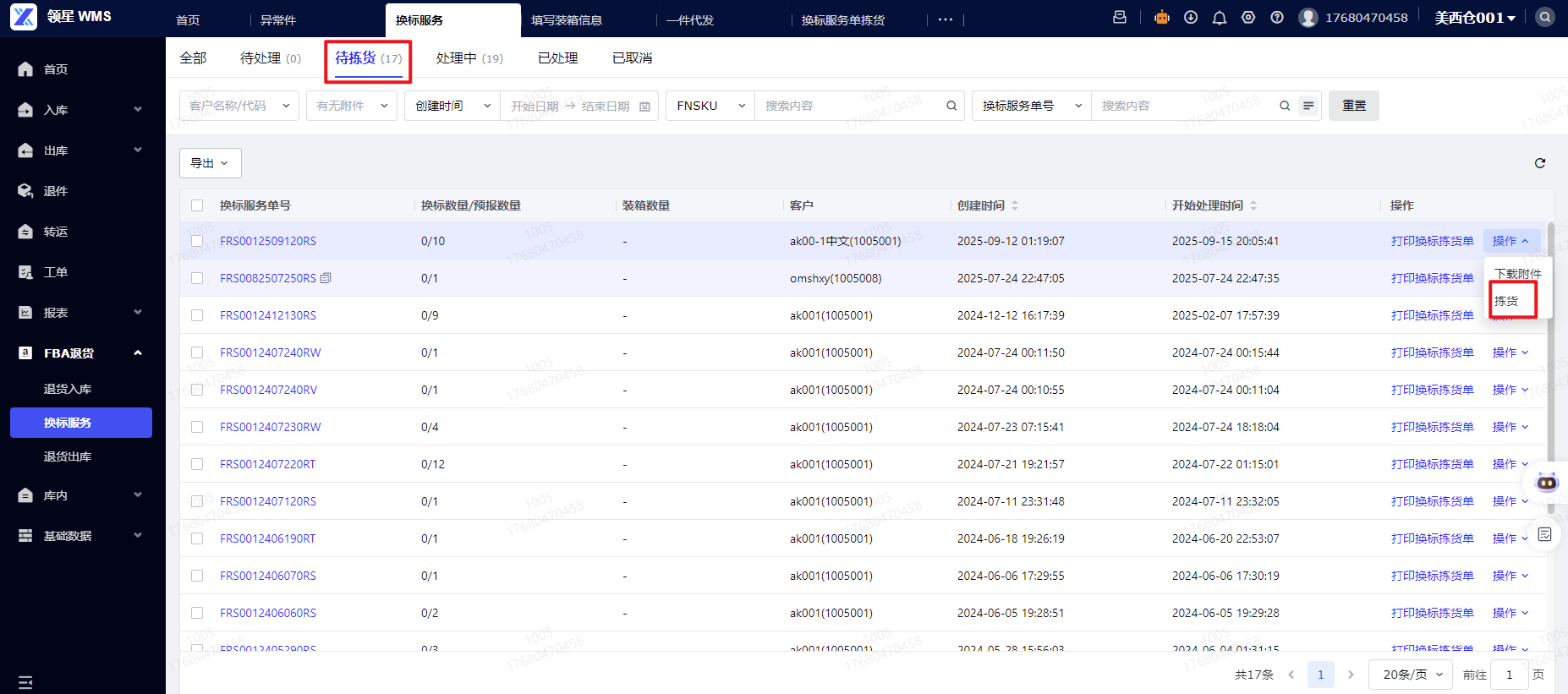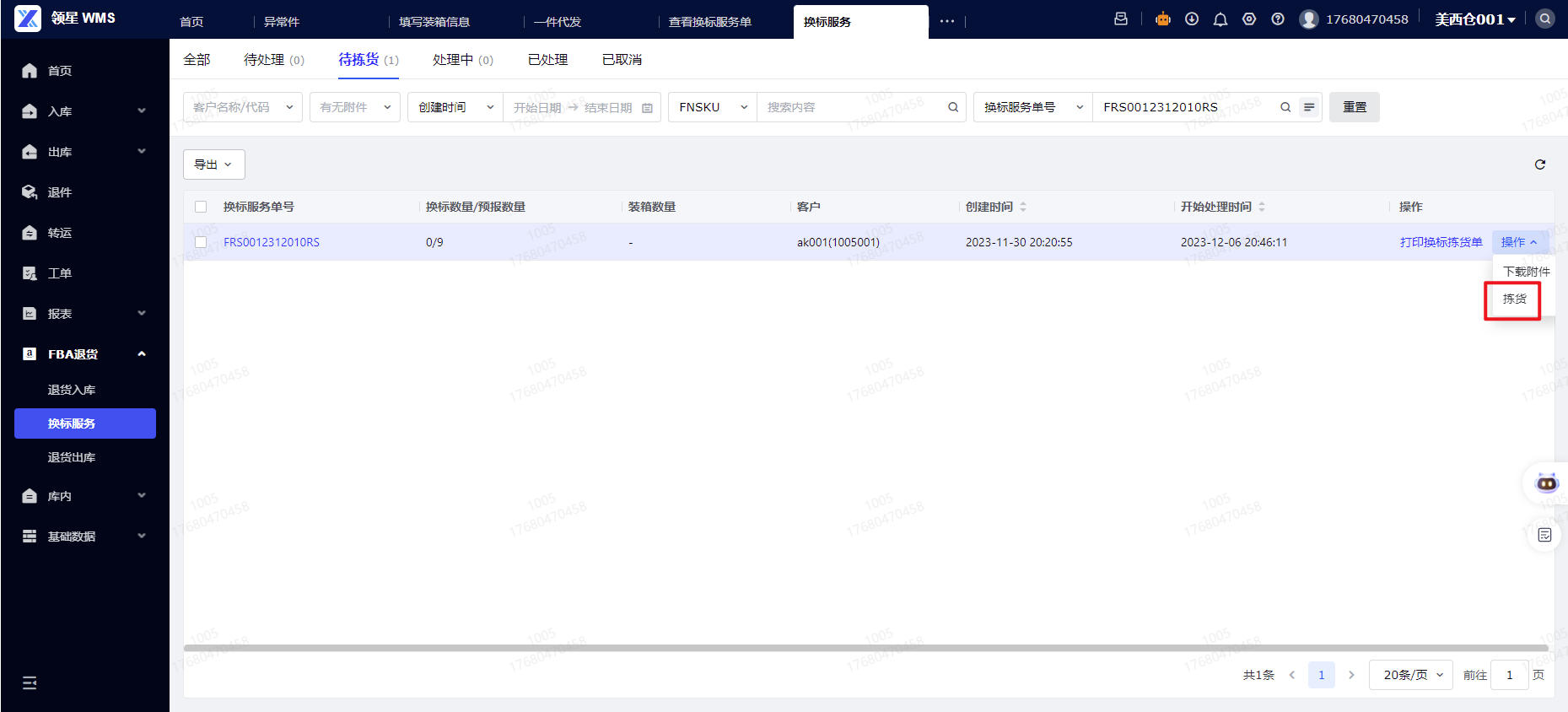 ● 待拣货:仓库可开始进行拣货操作。此时可打印换标拣货单和下载附件,此时退货换标单不可取消。