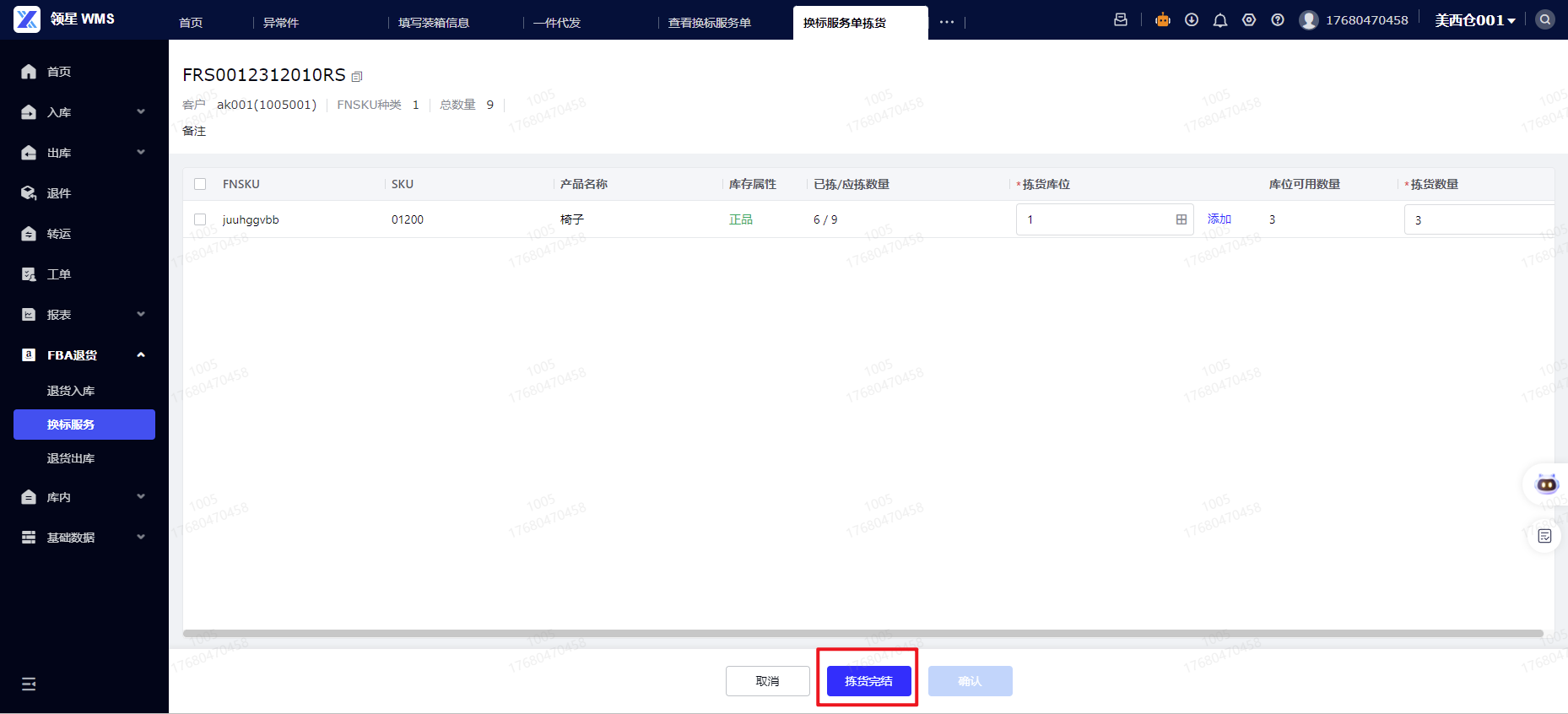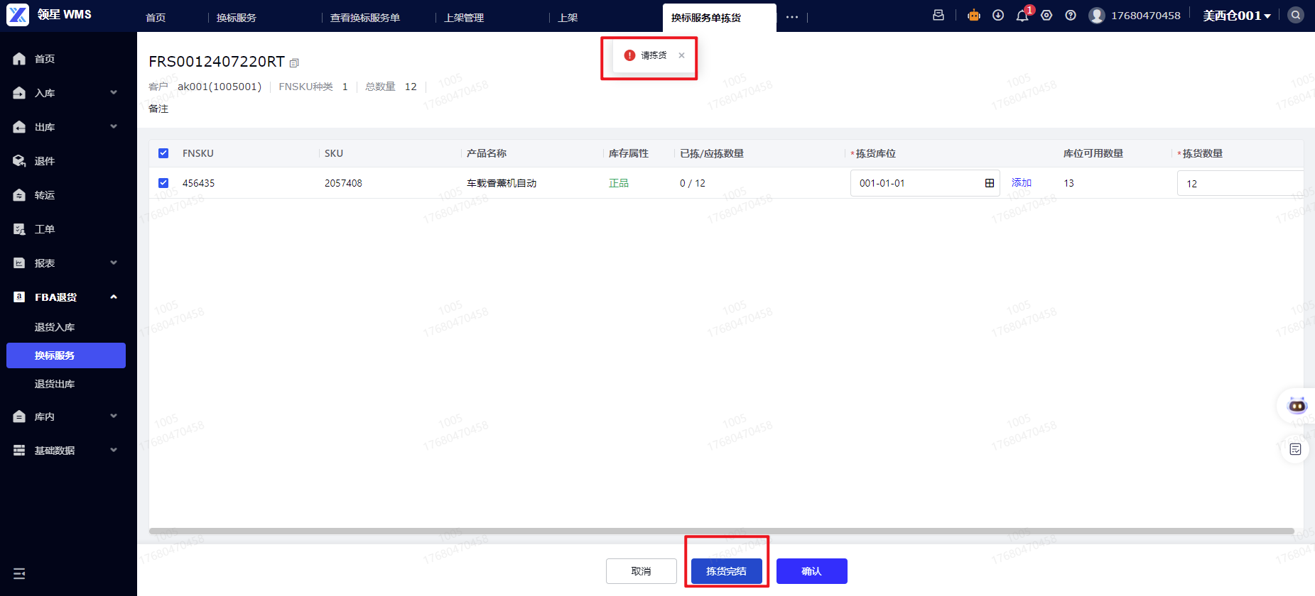 Q2:待拣货的换标服务单操作拣货完结,提示请拣货