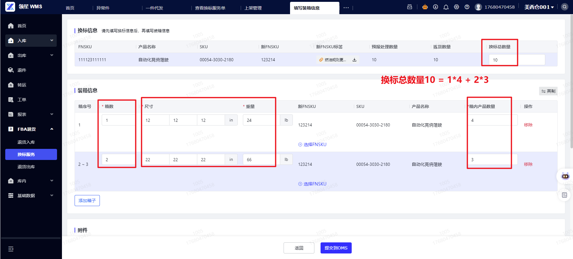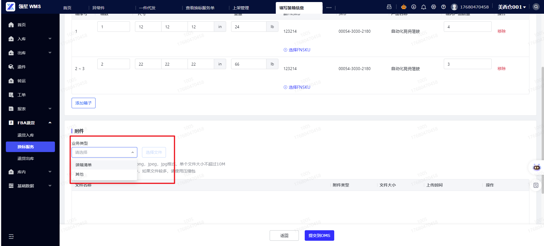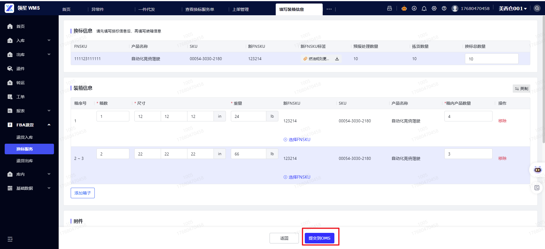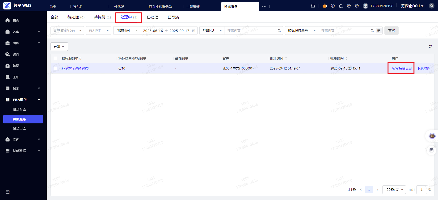 ● 处理中:仓库已完成拣货后,填写换标信息和装箱信息,提交到OMS,同时完成换标服务单的处理。
