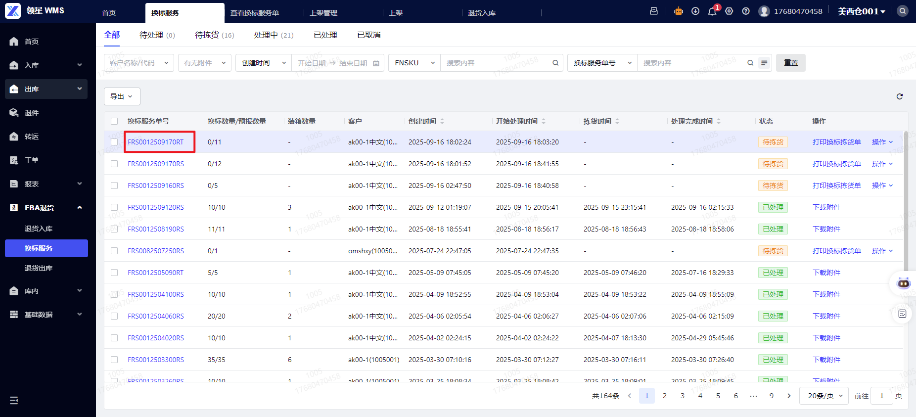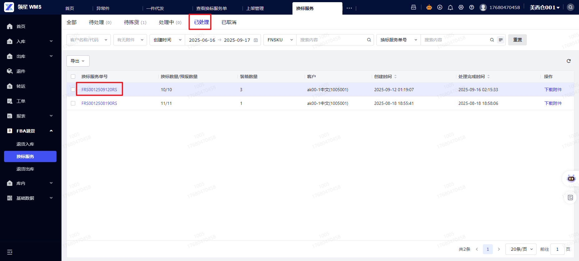 ● 已处理:仓库已完成该换标服务单拣货和换标。
