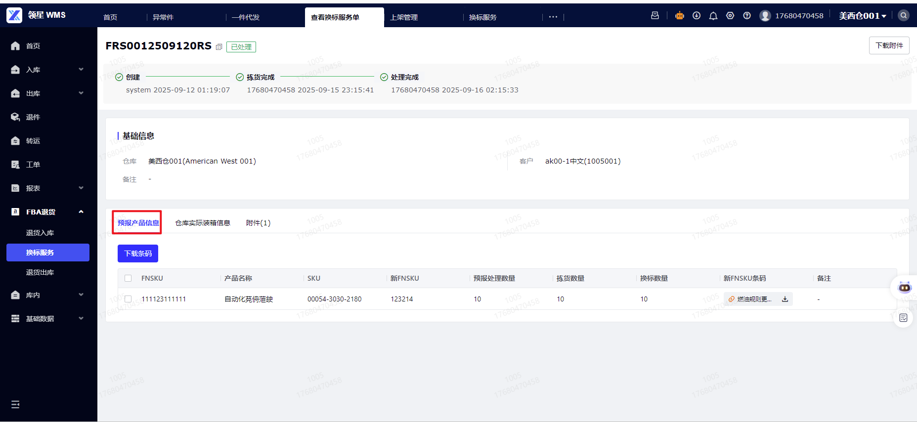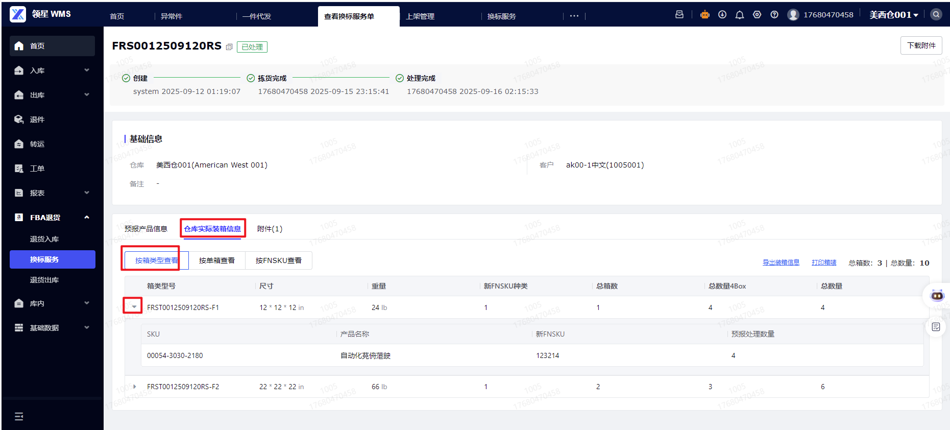 (8)查看单据预报和实际装箱信息:单据处理完成后,在已处理状态点击换标服务单号,在单据详情中可查看预报产品信息和仓库实际装箱信息(可按箱类型、单箱、FNSKU三个维度进行查看)