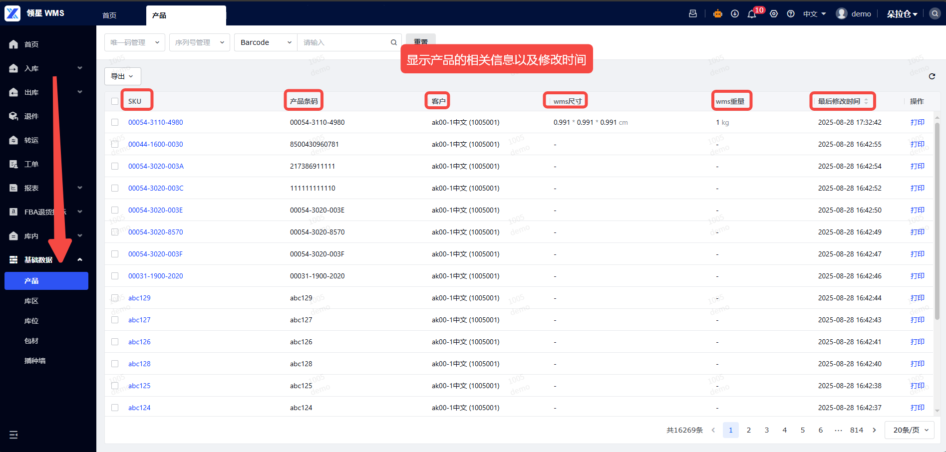 (2)进入WMS系统:导航至基础数据-产品菜单,打印产品信息