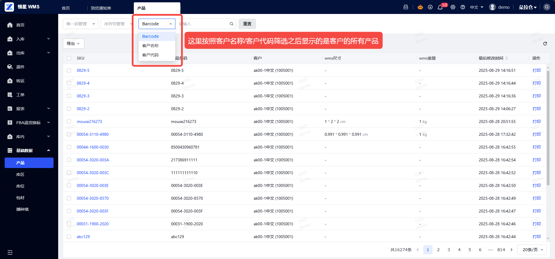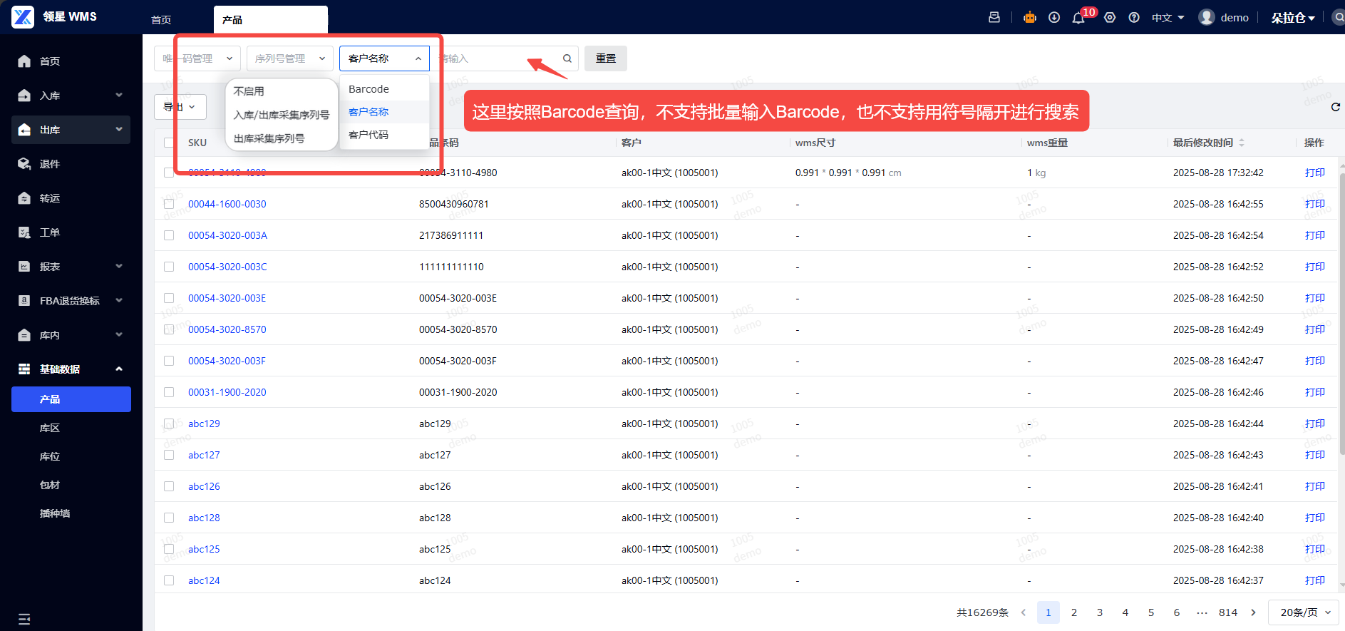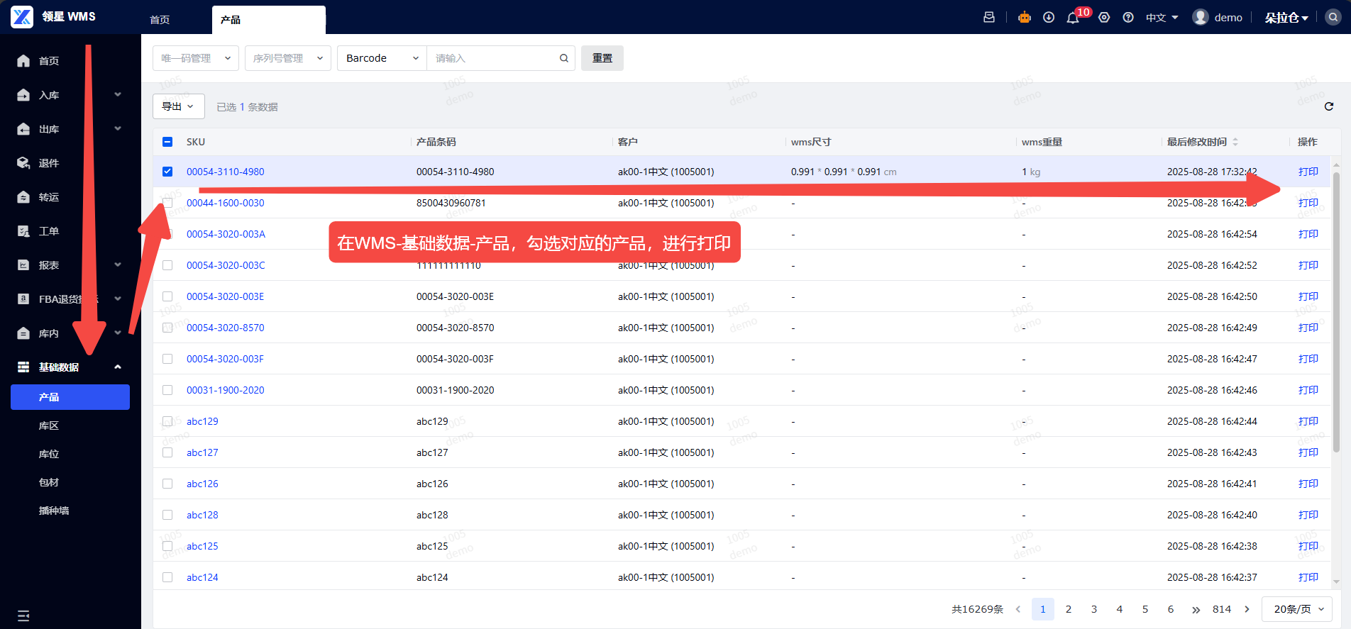 仓库人员通过输入产品的SKU/客户代码/客户名称等信息,在WMS系统中快速定位到该产品的尺寸重量/具体库存等信息,并执行打印产品标签(如FNSKU标签、条码标签)的操作。