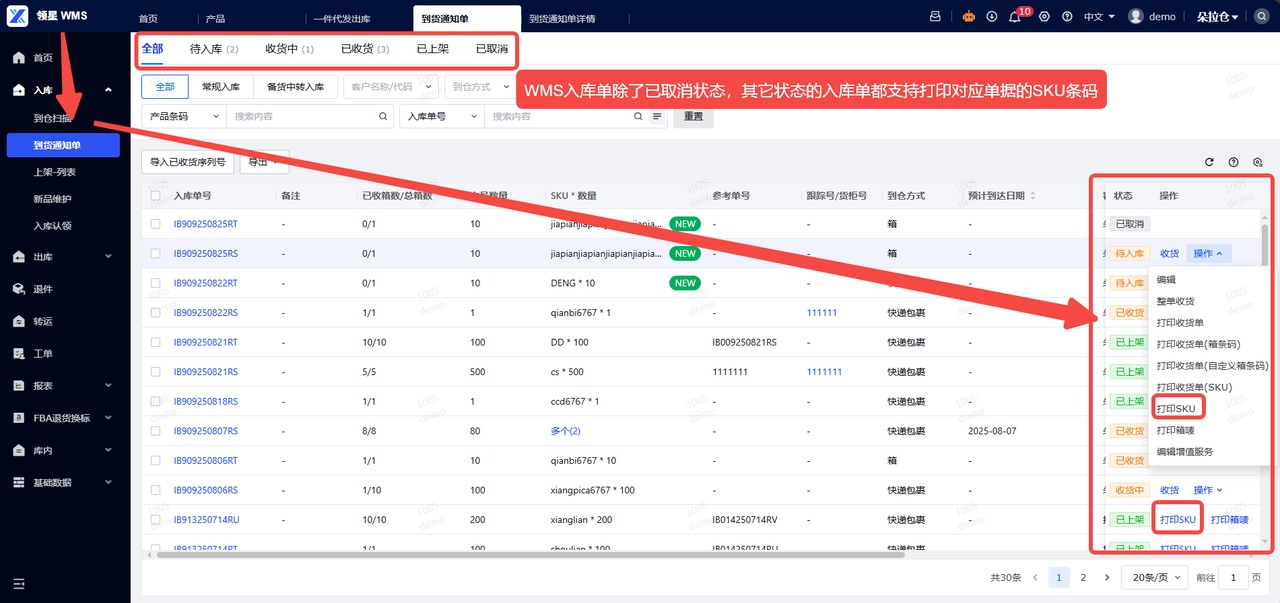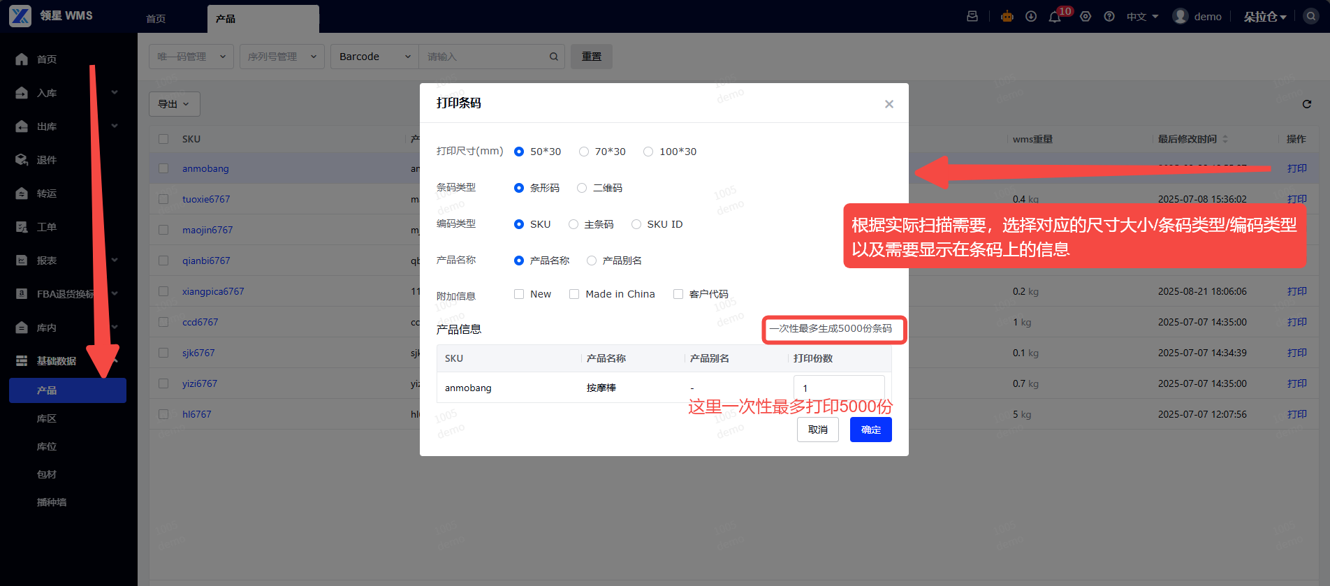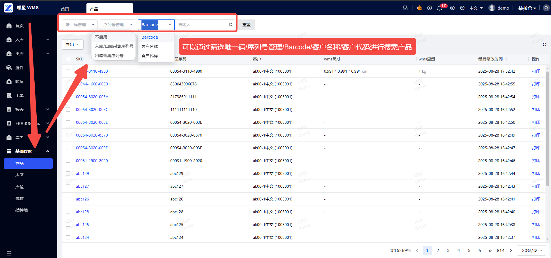 仓库人员通过输入产品的SKU/客户代码/客户名称等信息,在WMS系统中快速定位到该产品的尺寸重量/具体库存等信息,并执行打印产品标签(如FNSKU标签、条码标签)的操作。