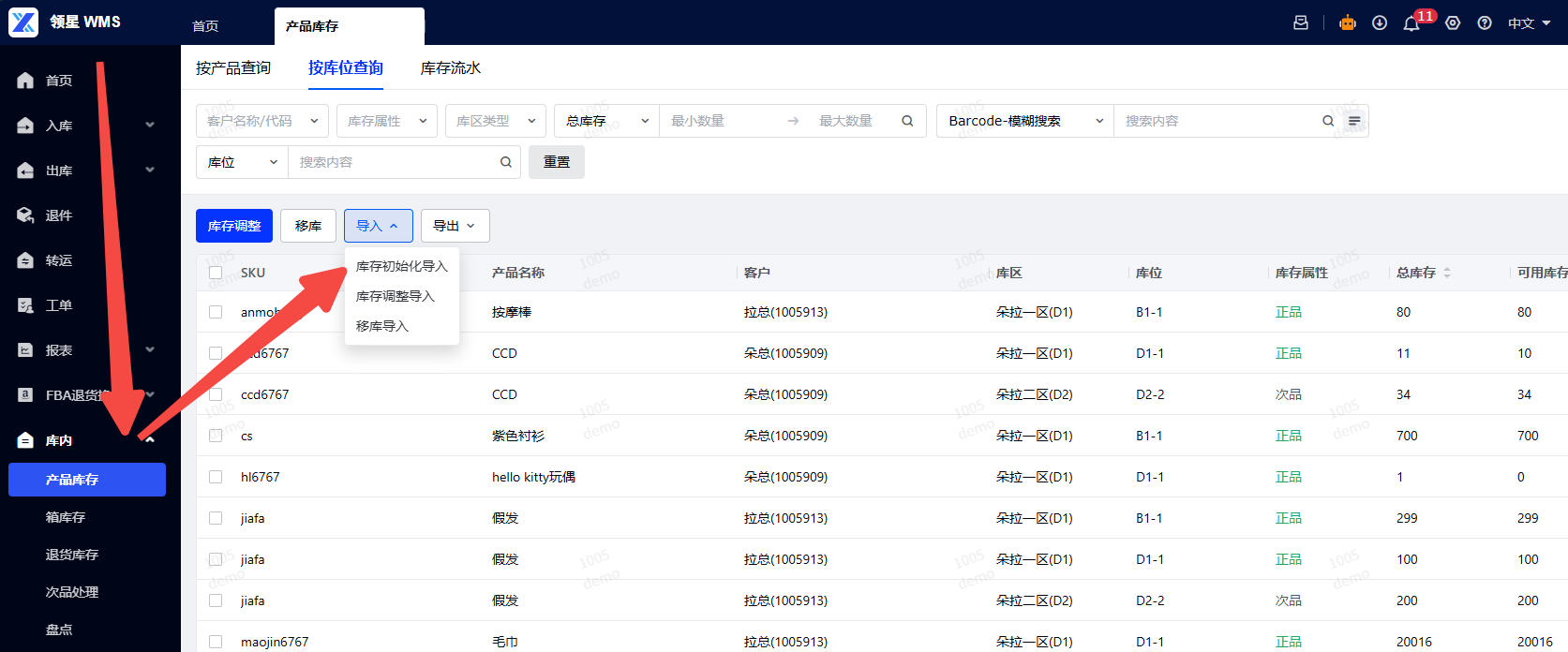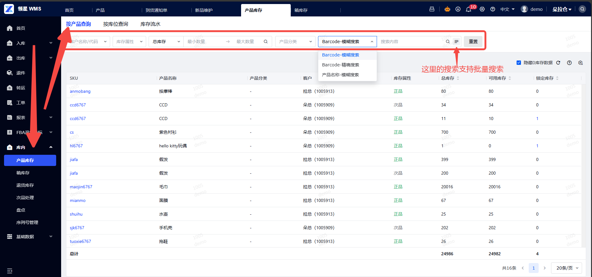 答案:在WMS-库内,选择对应的库存类型,可以查看到在库所有产品的库存;也可以按照Barcode精准搜索/模糊搜索/产品分类/客户代码进行筛选查看。