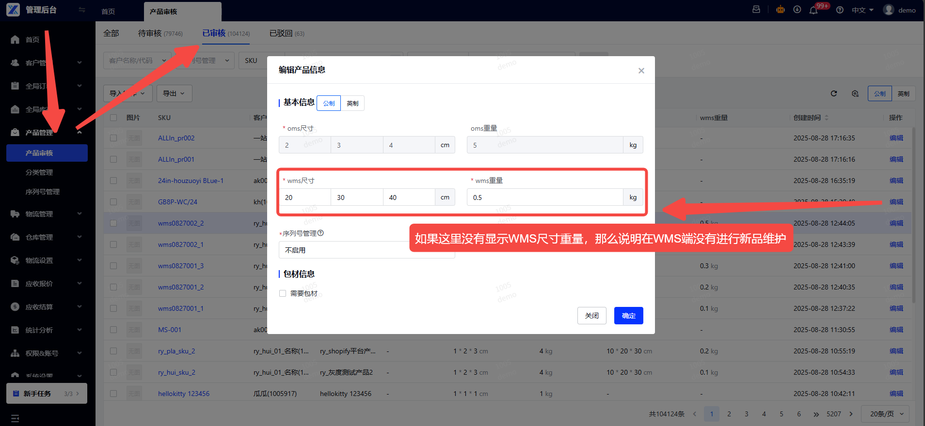 答案:在OMS查看产品是否有WMS尺寸重量数据,若没有,则需要在WMS端进行新品维护。