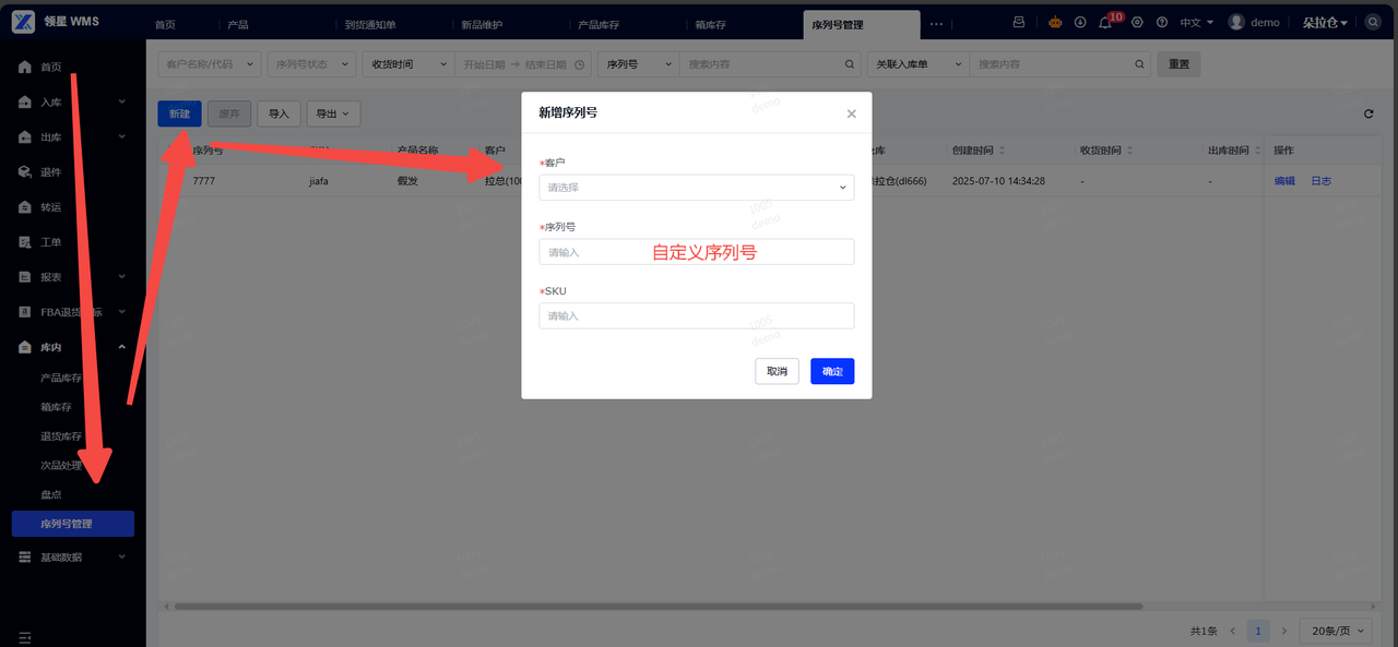 答案:WMS-库内-序列号管理,可以新建序列号。