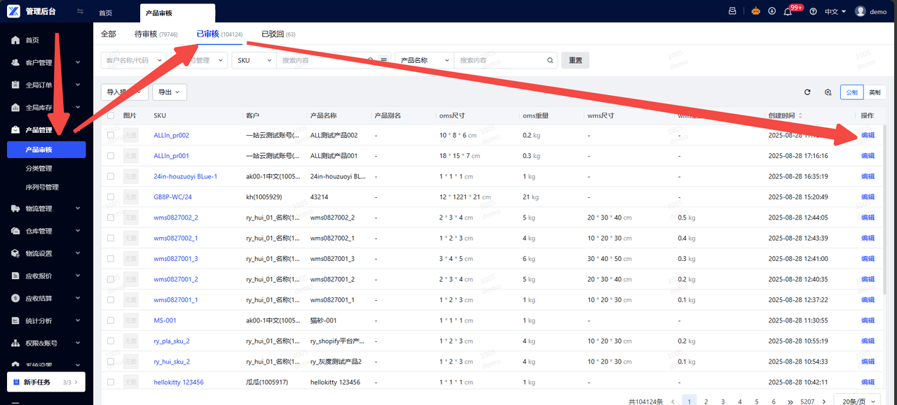 (1)进入WMS系统:登陆WMS系统,导航至基础数据-产品菜单,查询产品信息