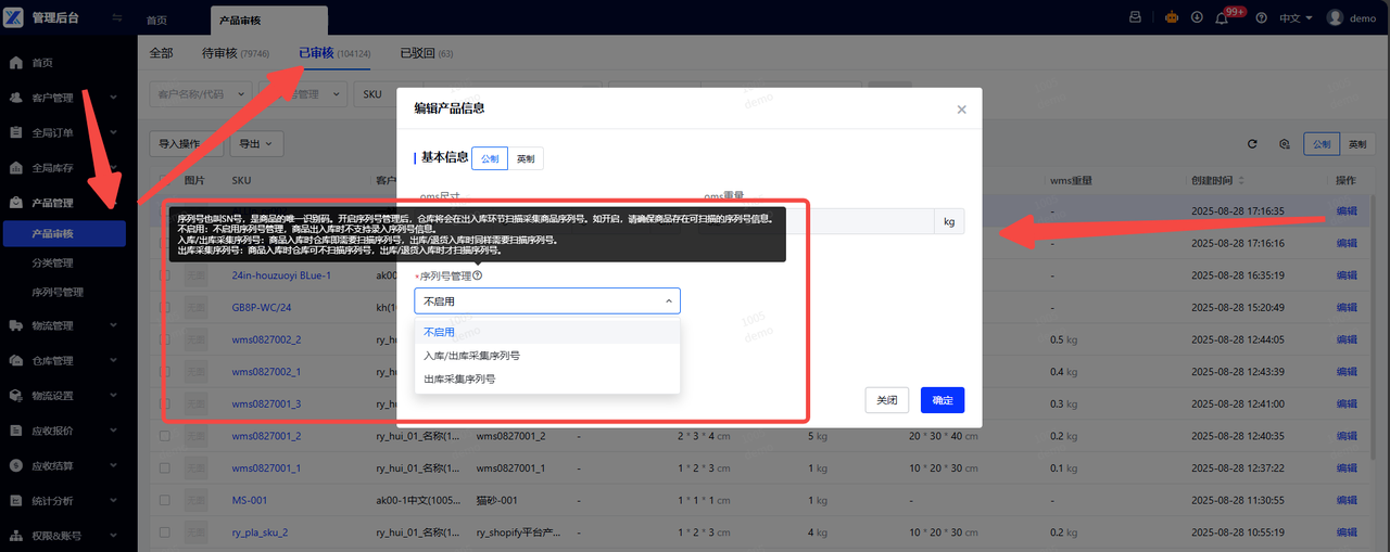 答案:OMP-产品管理-产品审核,对已审核状态的产品可进行编辑,在编辑内勾选是否开启序列号管理。