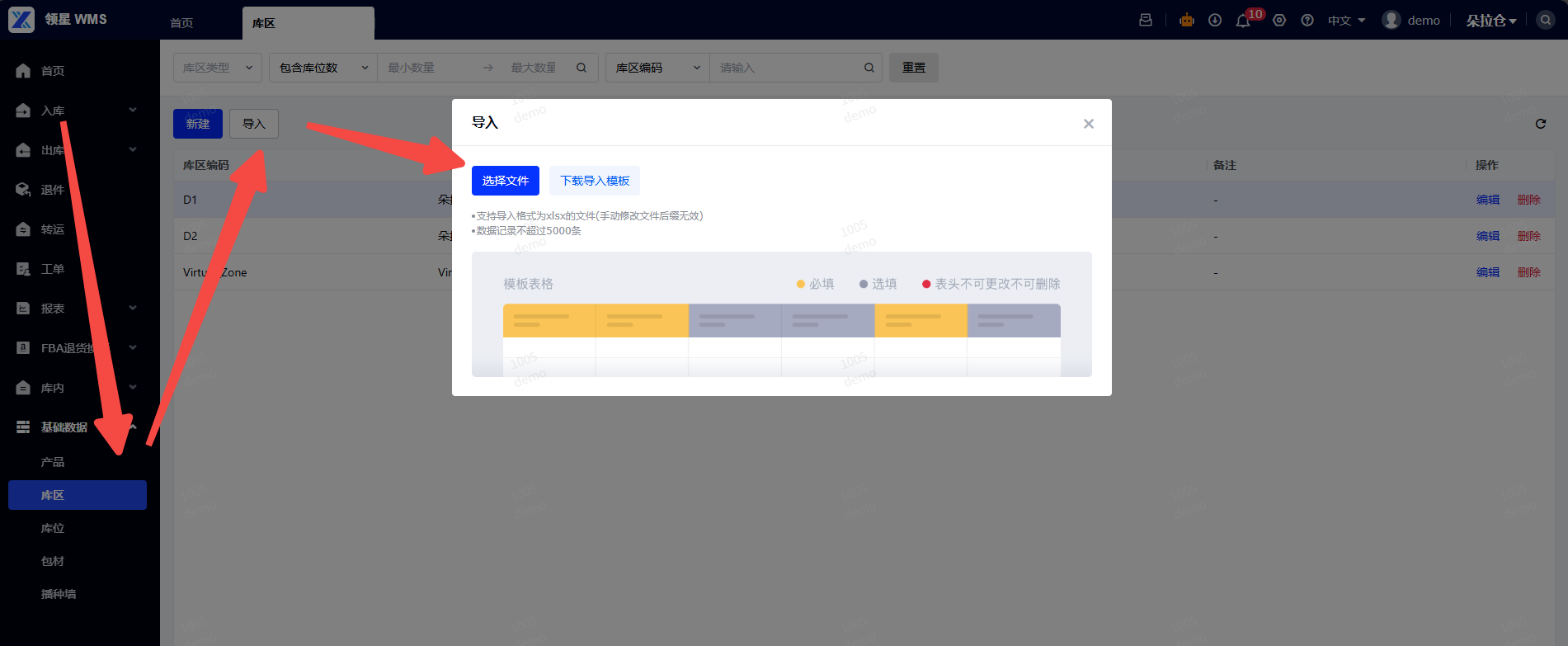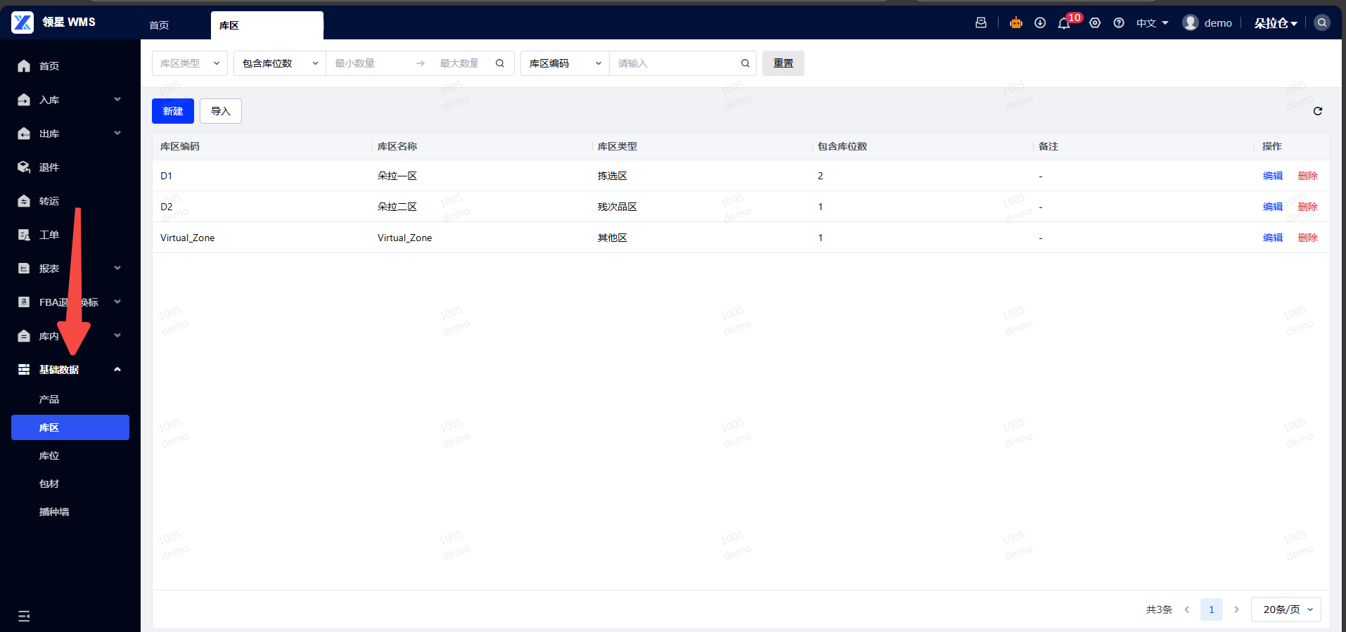 (1)进入WMS系统:登陆WMS系统,导航至基础数据-库区菜单