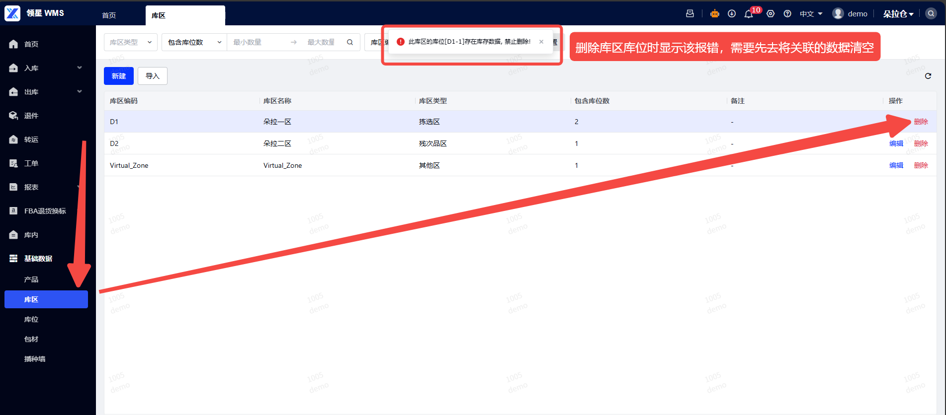 答案:不支持,但是将库区库位的库存清空后,可以直接删除。