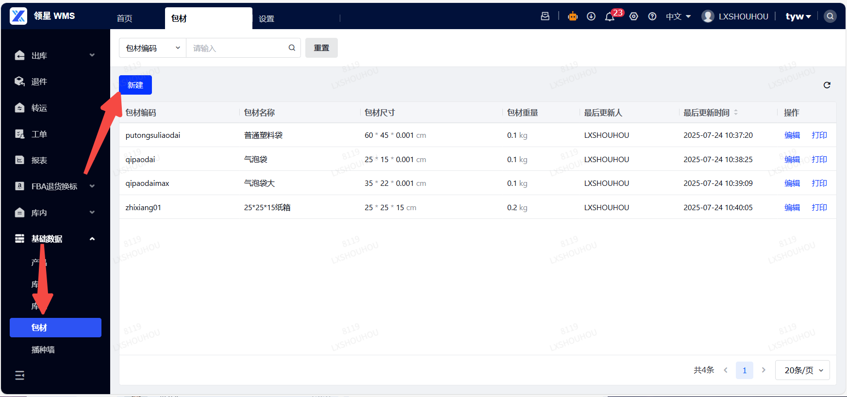 登录系统,进入 WMS 模块,依次点击路径:基础数据 > 包材;
