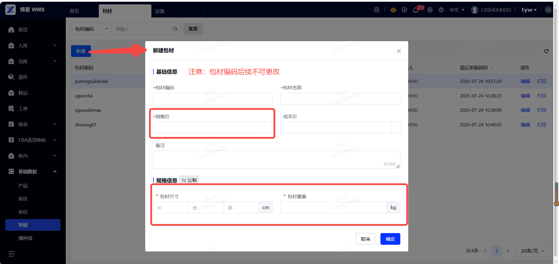 定义:该场景是绑定包材功能的前置准备环节,指仓库操作人员进入 WMS 系统,通过 “基础数据 - 包材” 路径点击 “新建”,逐项完善包材核心信息(含包材编码、包材名称、销售价、长 / 宽 / 高尺寸及重量),完成包材基础数据录入的操作过程。
