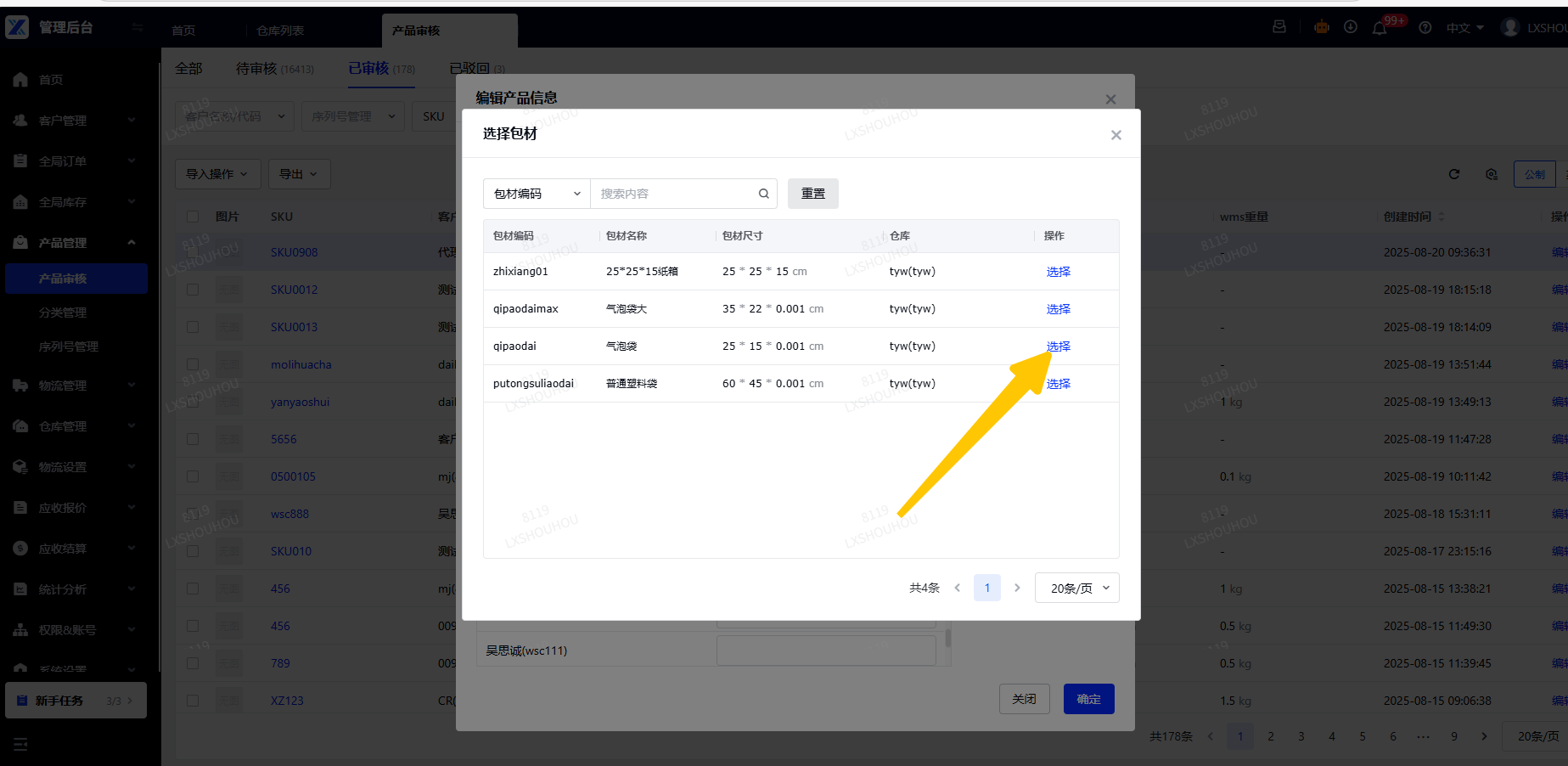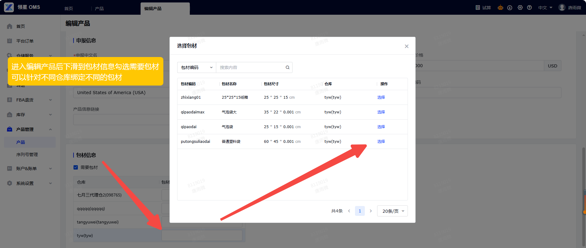 包材信息处勾选需要包材,点击包材那一栏进入选择包材进行绑定