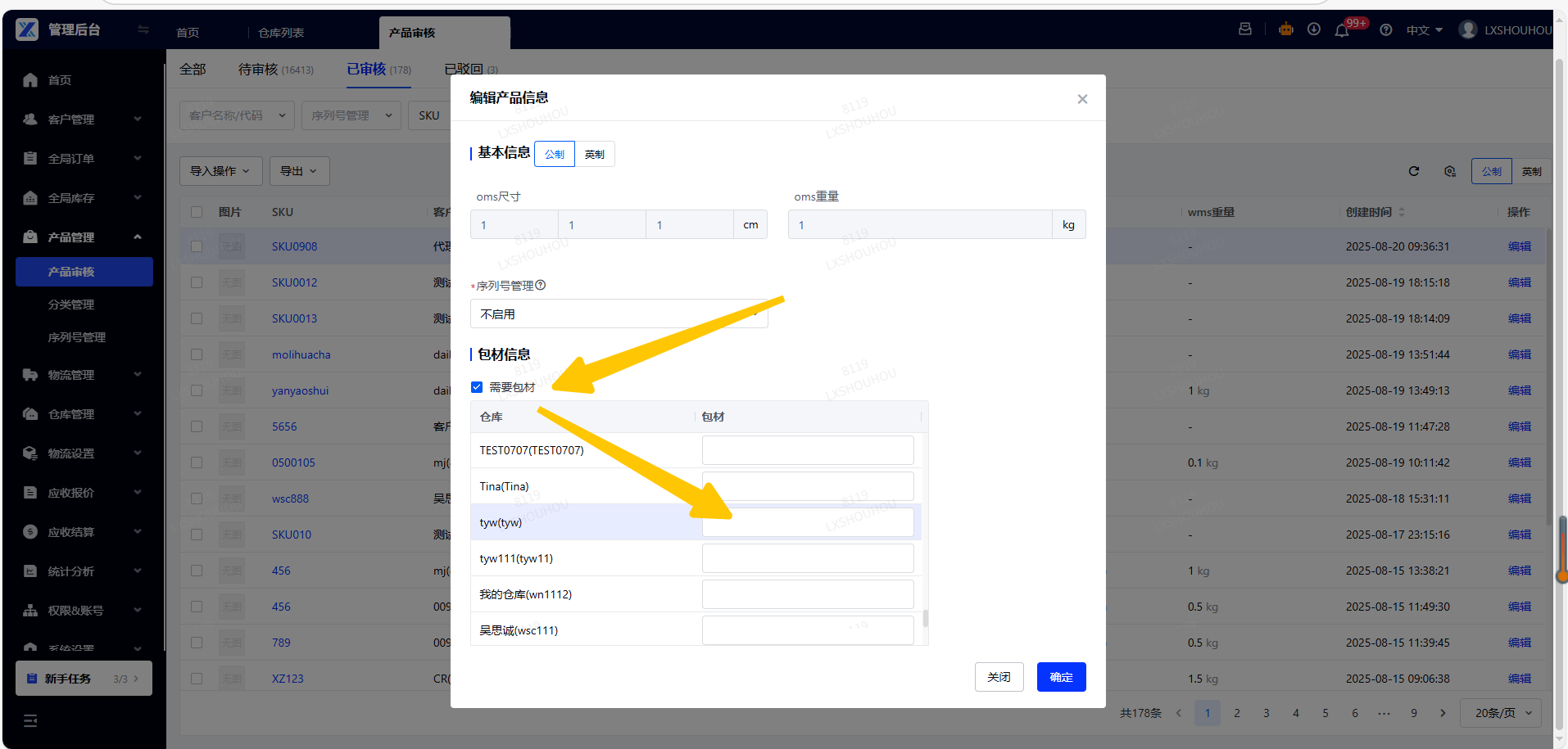下滑到最下面勾选需要包材,然后可以针对不同仓库选择包材进行绑定