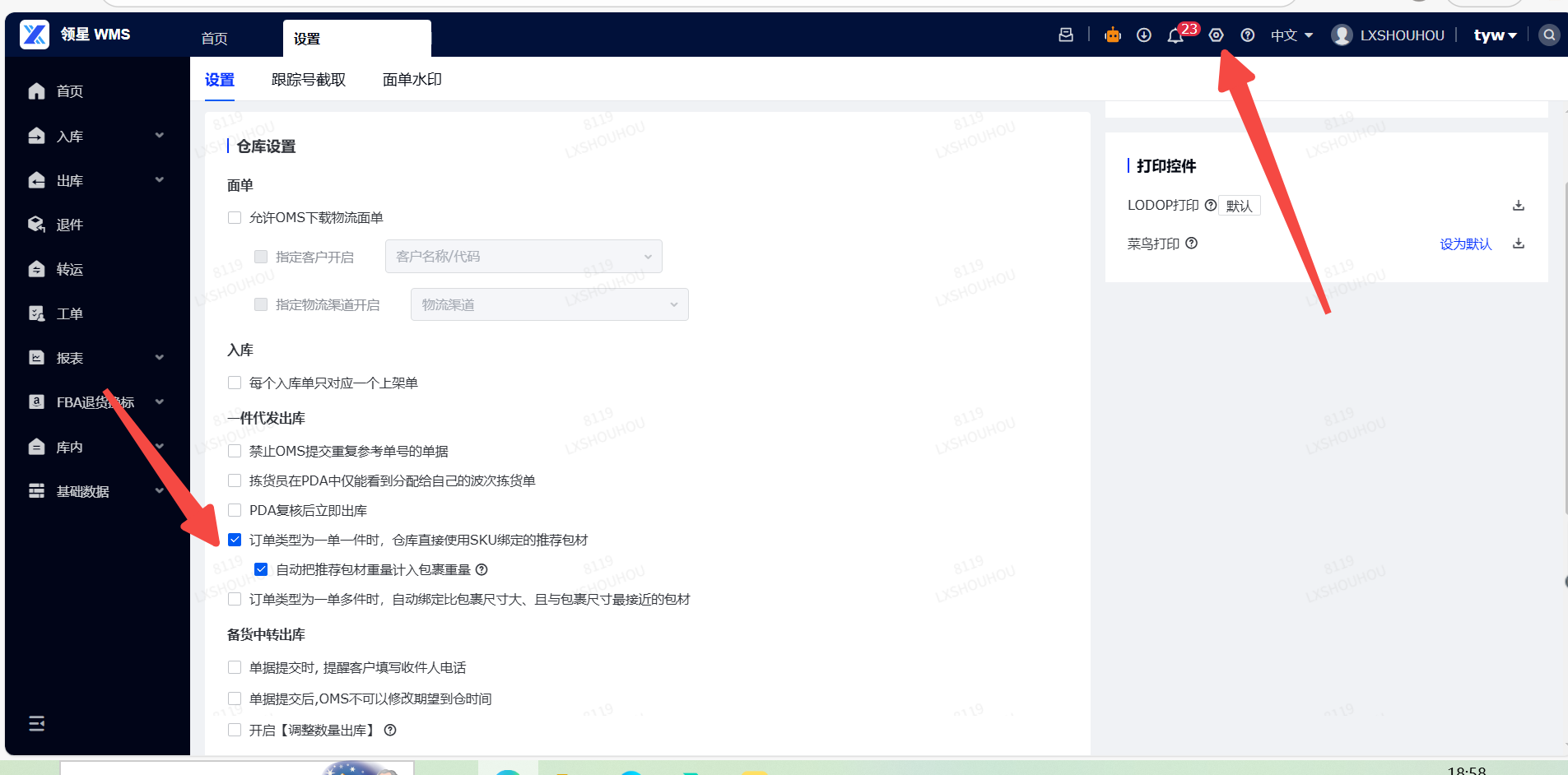 ● 勾选后:若一单一件的一件代发单中,产品已绑定 “推荐包材”,仓库端无需手动绑定,系统将自动调用推荐包材出库;