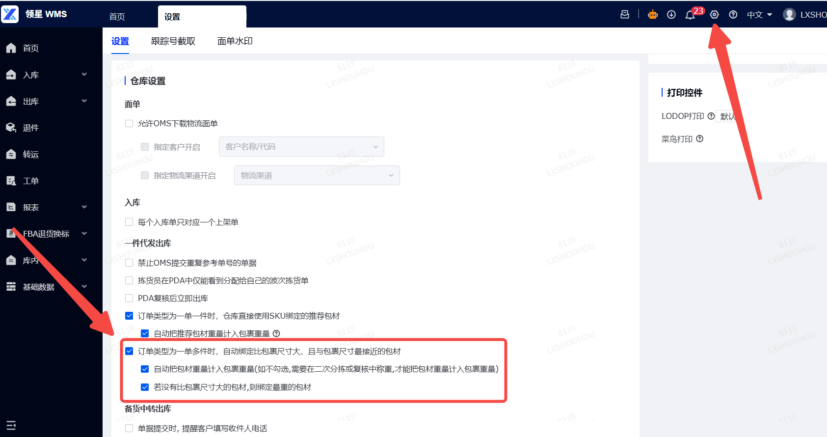 ● 该配置项默认 “不勾选”:需仓库端在出库时手动进行包材绑定操作;