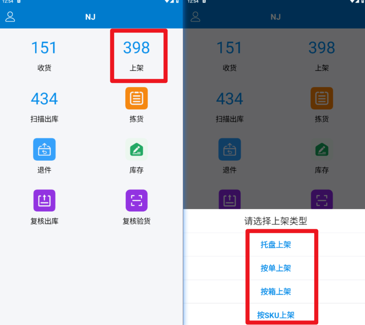 (1)进入PDA系统:登录您的PDA管理后台,导航至上架菜单。有托盘上架、按单上架、按箱上架、按SKU上架四种上架方式。