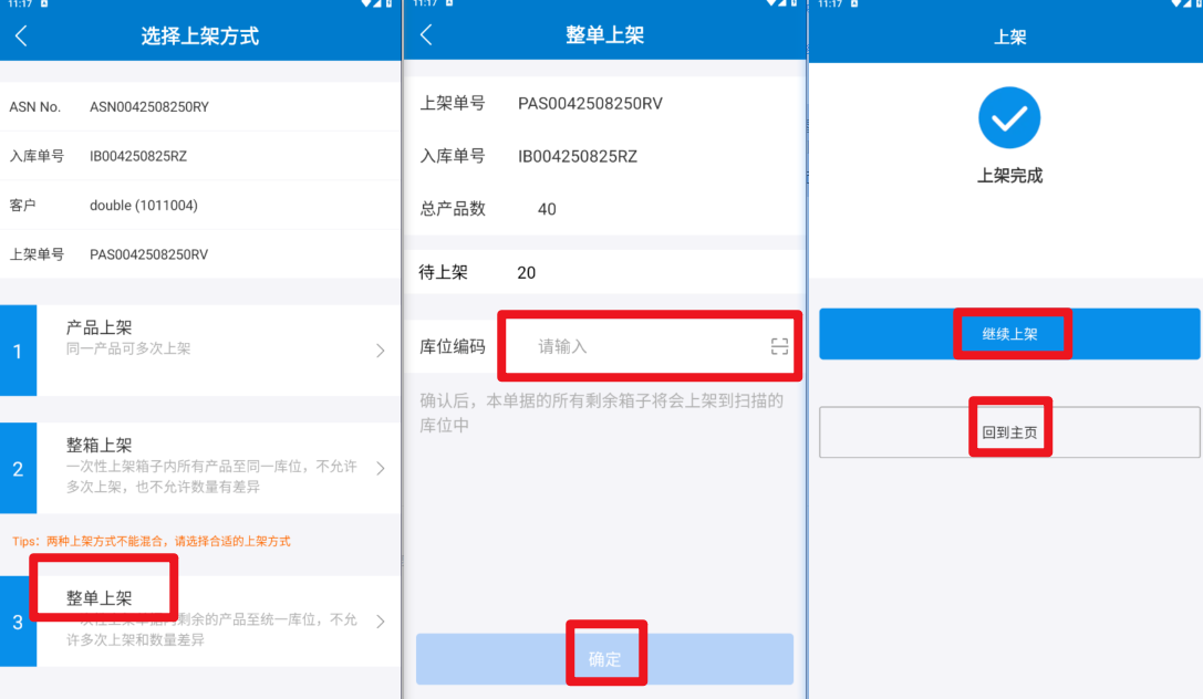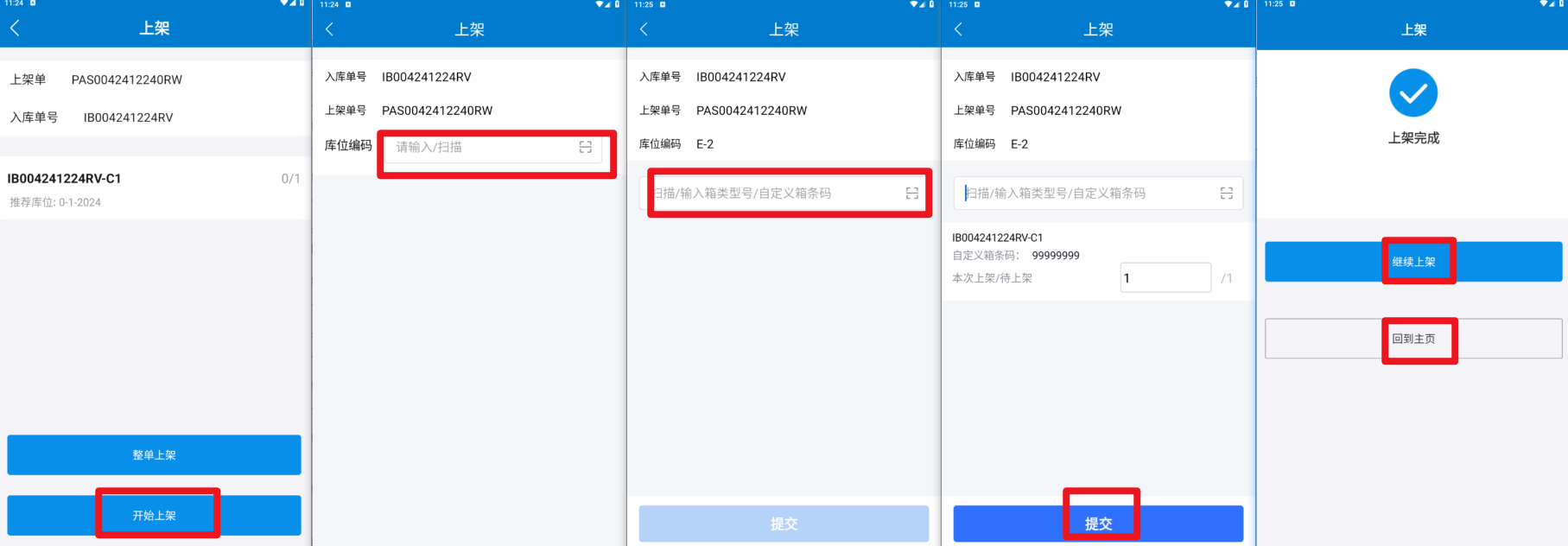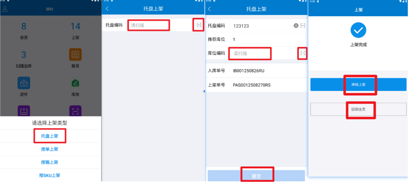(2)托盘上架:导航至托盘上架,扫描或手动输入对应的托盘编码,继续扫描或手动输入库位编码,点击提交后,该托盘中的所有SKU将上架到对应库位并产生一条库存流水。上架完成之后可以点击继续上架或者回到主页。