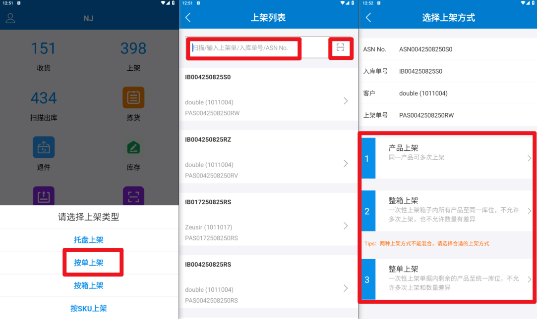 ● 按单上架:可以扫描上架单/入库单,针对一个单据选择上架方式 。