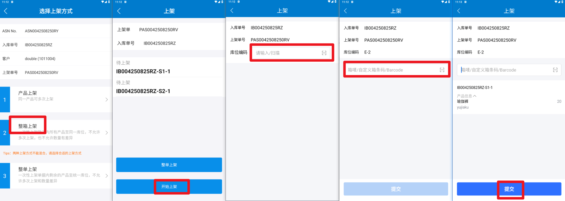 (6)整单上架:点击整单上架,扫描库位编码后,点击提交,可以将本单据剩余的所有箱子/产品上架到对应库位。