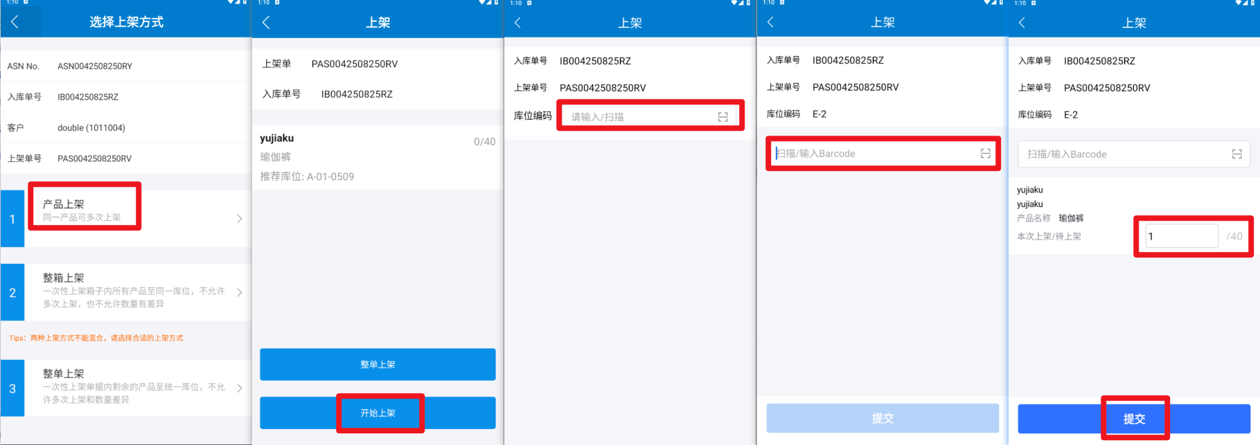 (4)产品上架(即按SKU上架):点击产品上架,在上架单概况页,可以看到本次要上架的SKU、产品名称、待上架数量、推荐库位。点击开始上架后进入操作页,操作页扫描库位编码,继续扫描产品Barcode后,可以手动输入要上架的数量,点击提交后即可上架。