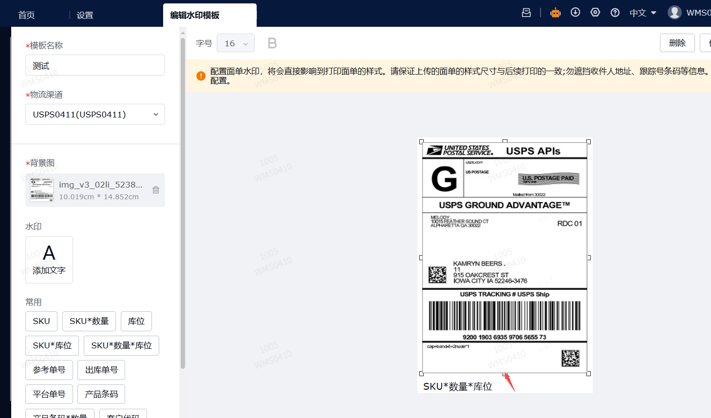 - 如何测试:配置水印模板并启用后,将会对使用该渠道下单的新订单生效。强烈建议您在您的测试OMS账号中用该渠道下一单,检查下是否会覆盖面单的关键信息 - 收件人信息、条码等。确认后再正式投入使用
