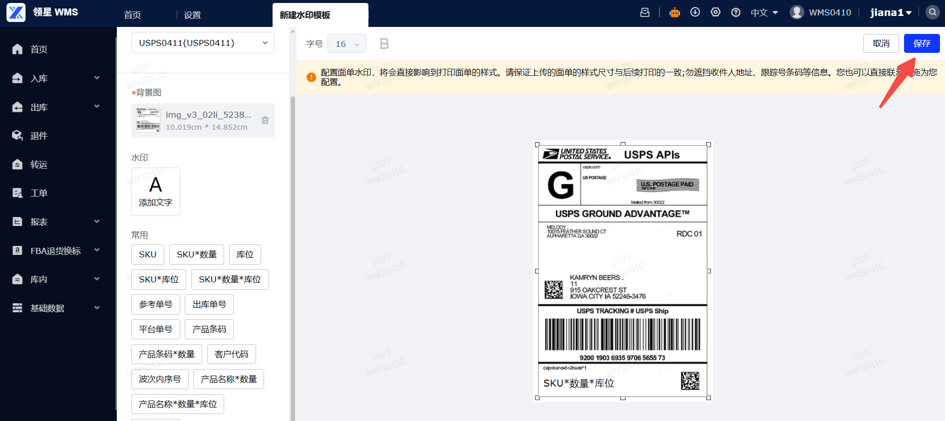 (6)保存面单水印模版:设置完成后点击右上角的保存按钮保存模版