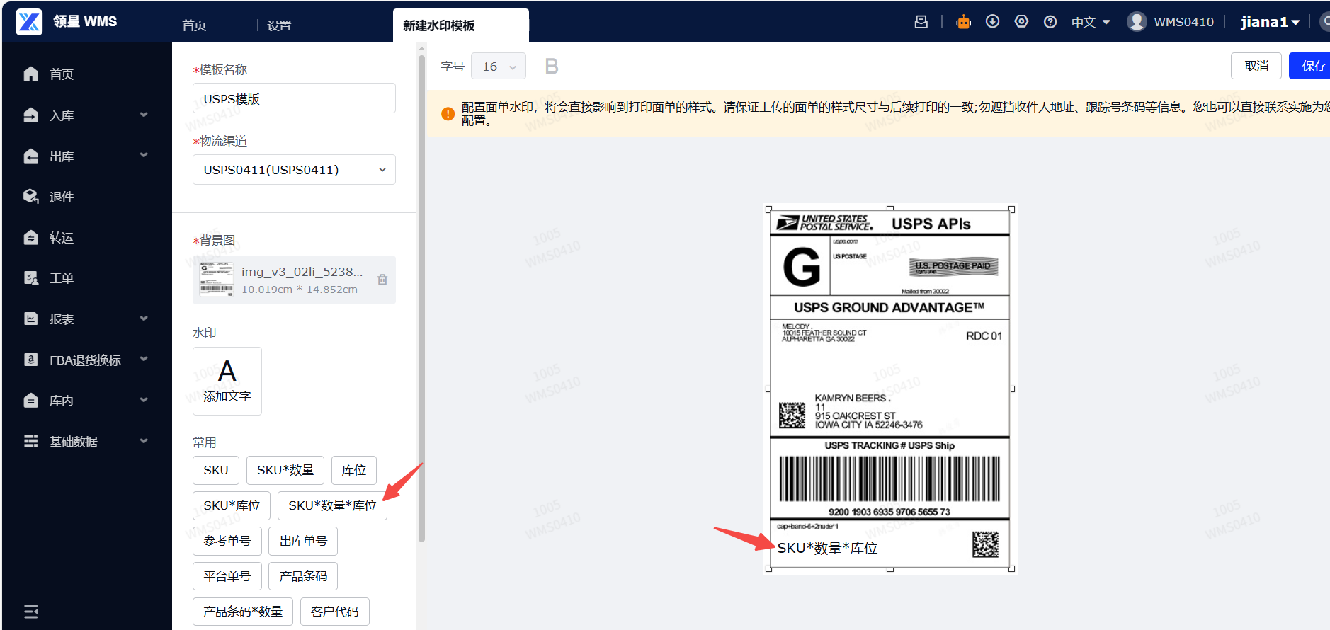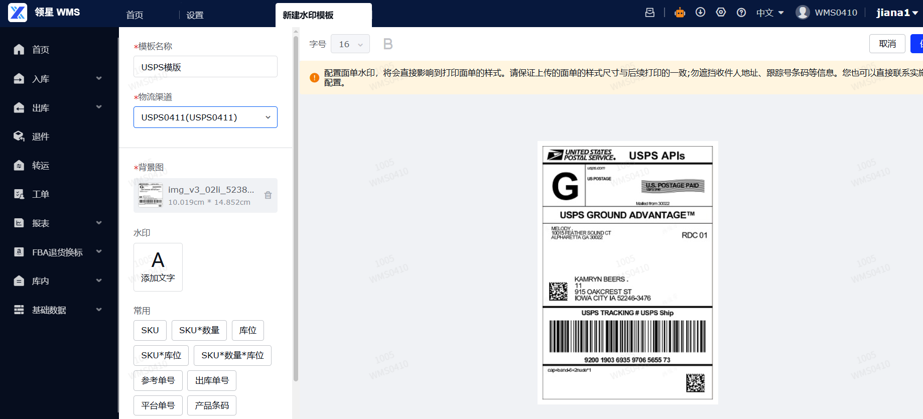 定义:面单是仓储的出库流程中的最关键单据,如在面单上能展示单号、SKU、库位等信息,可以极大提高仓储操作效率作用:通过自定义水印,可以解决以下问题: 1) 很多打单系统添加水印时会有长度、空间限制,自定义水印可以控制加水印的位置,完整展示信息 2)一些打单系统/电商平台的面单,不支持对接面单的备注字段(添加SKU*数量等信息),可以给客户创建自定义渠道,仓库自己添加水印 3)打印时可以添加库位,可以直接拿着面单去拣货,极大提高大件订单的拣货效率。