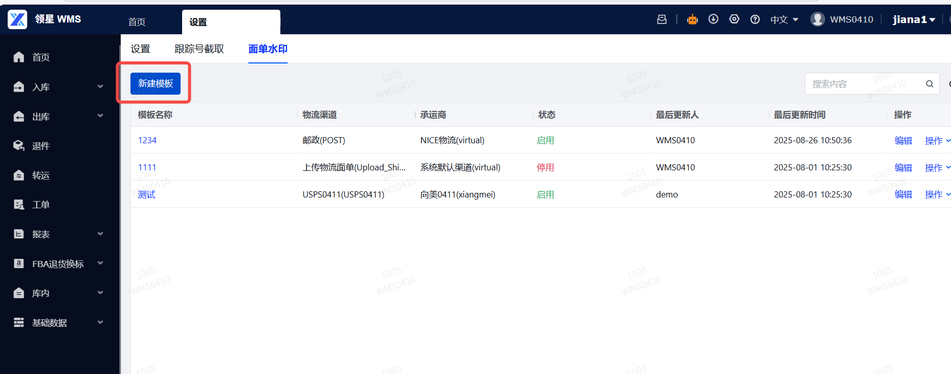 (3)新建模版:点击新建模版按钮,创建新的面单水印模版