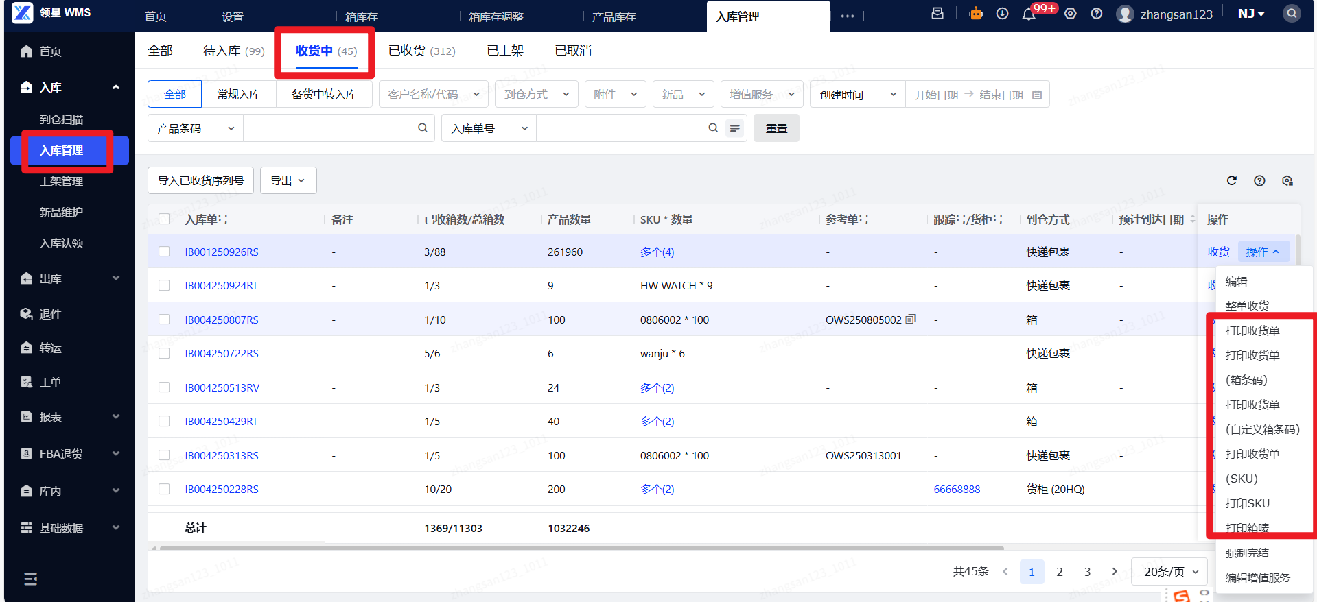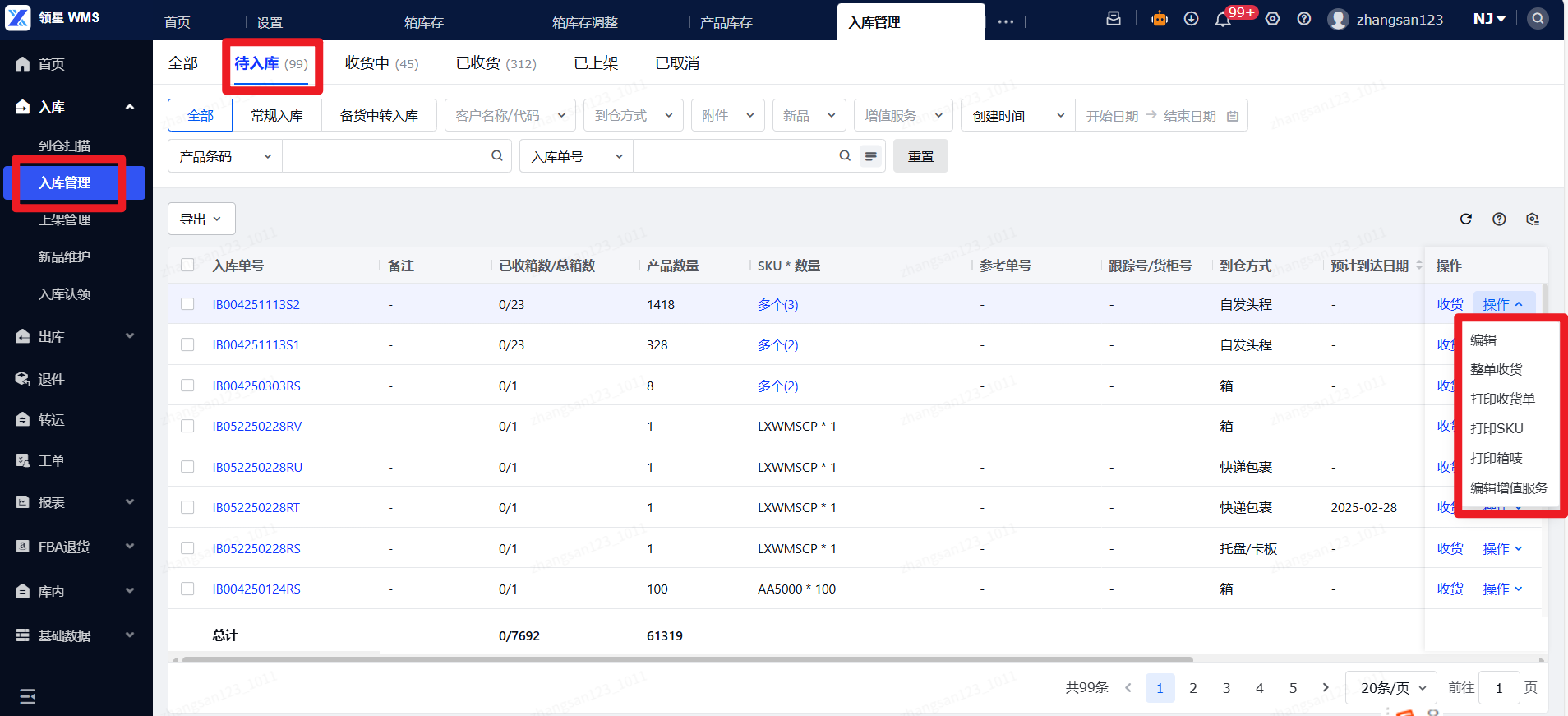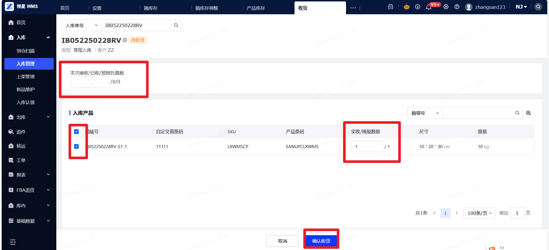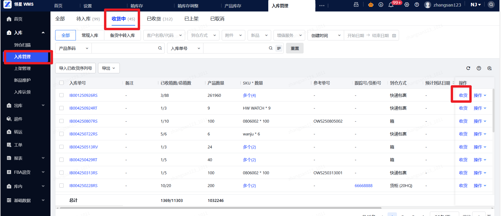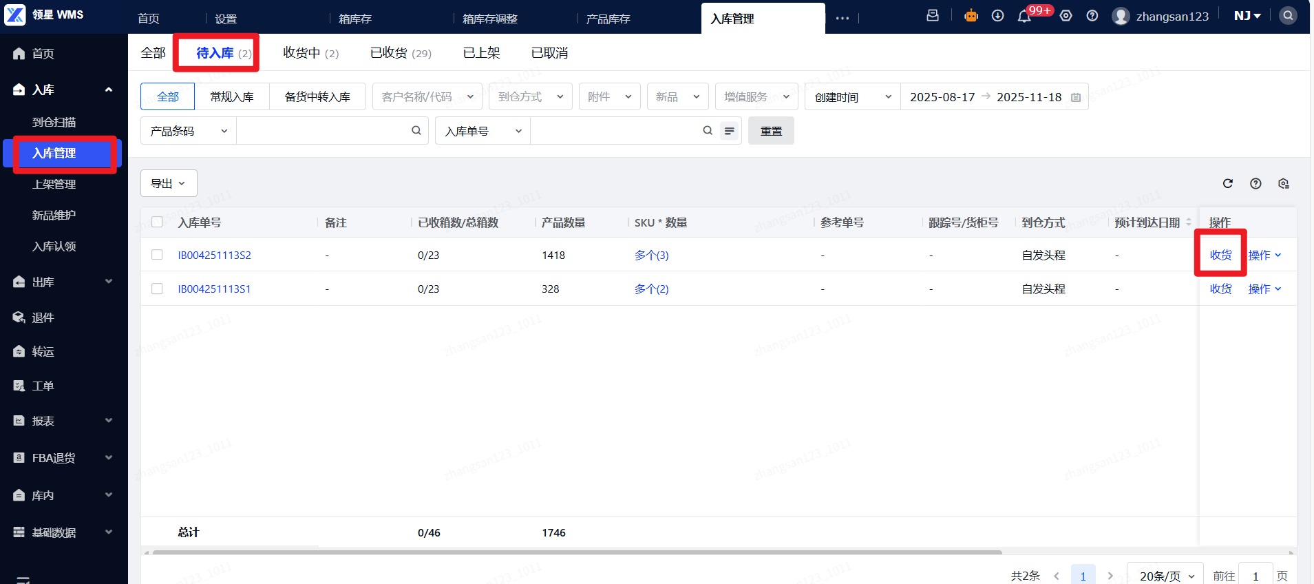 (2)收货:导航至入库管理菜单,待入库状态,点击收货按钮。