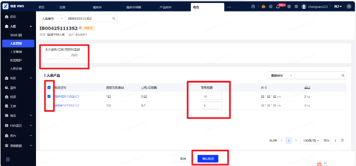 (3)常规入库收货:收货的时候请清点每箱产品数量,准确填写实际到仓的产品数量,确认无误后勾选需要收货的项,并点击确认收货。
