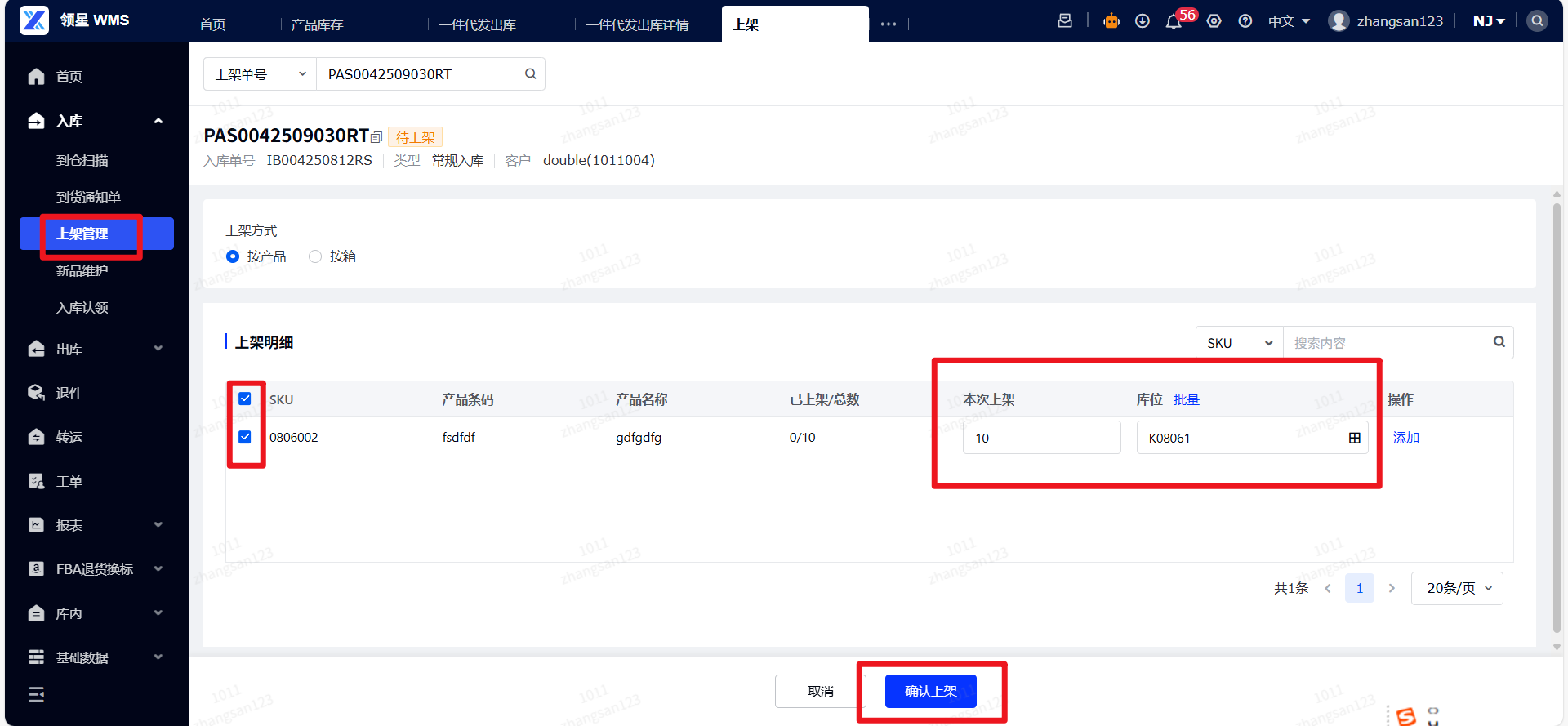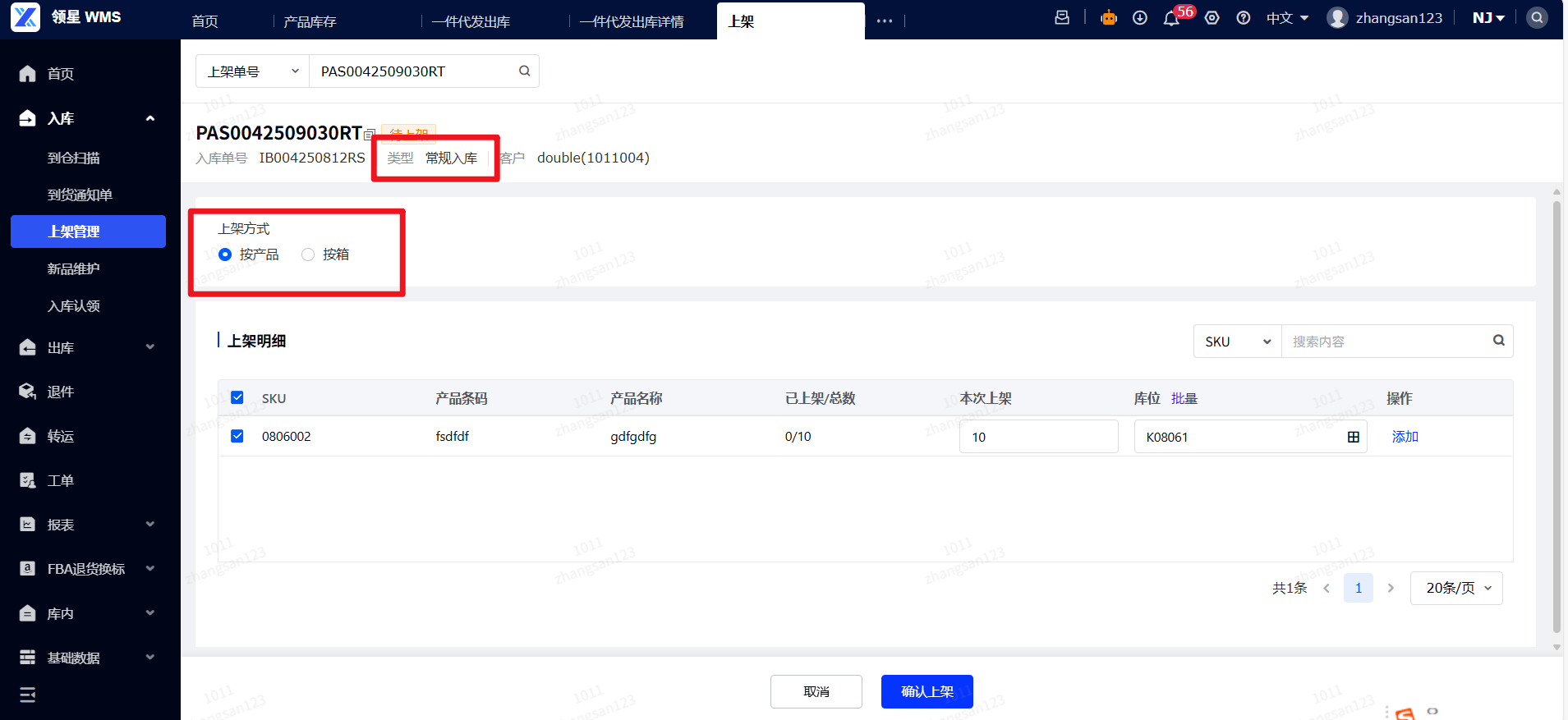 (3)常规入库上架:勾选需要上架的项,填写本次上架数量,选择库位,点击确认上架。