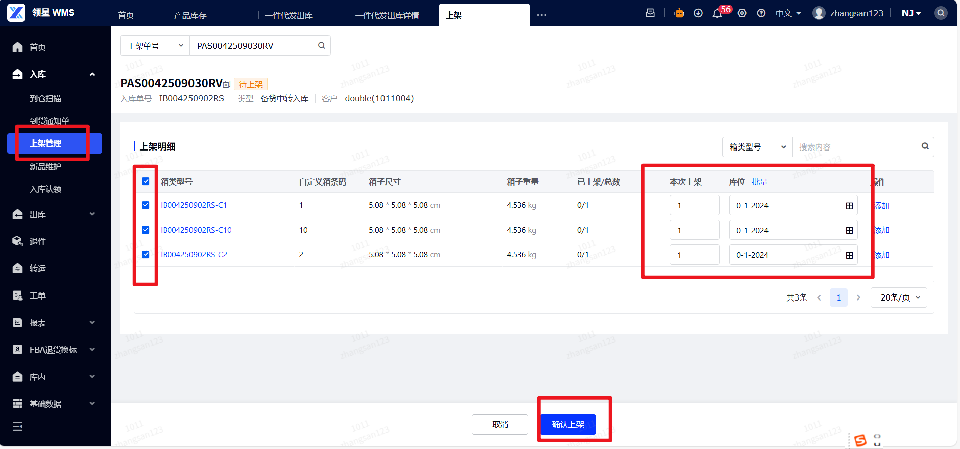 (4)备货中转入库:仅支持按箱上架,上架的时候,请勾选需要上架的项,填写本次上架数量,选择库位,点击确认上架。