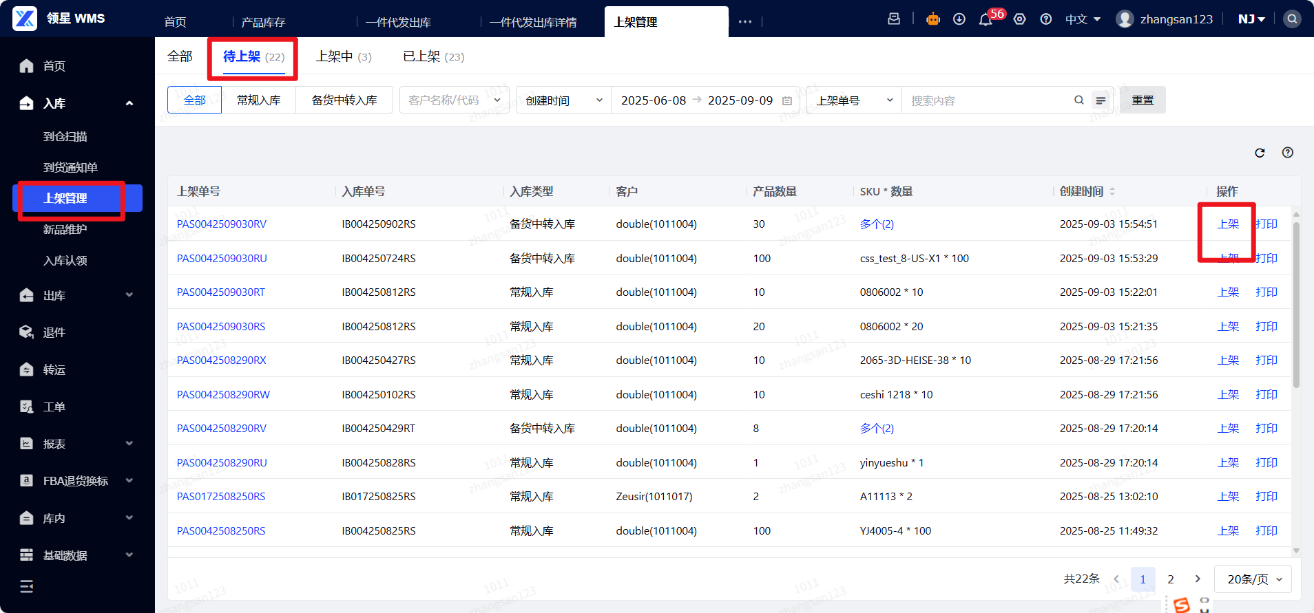 ● 待上架:表示该上架单还未开始上架。可点击上架按钮进行上架操作,若一次性上架完成,上架单会流转至已上架状态;若分批上架,未能一次性上架完成,上架单会流转至上架中状态。
