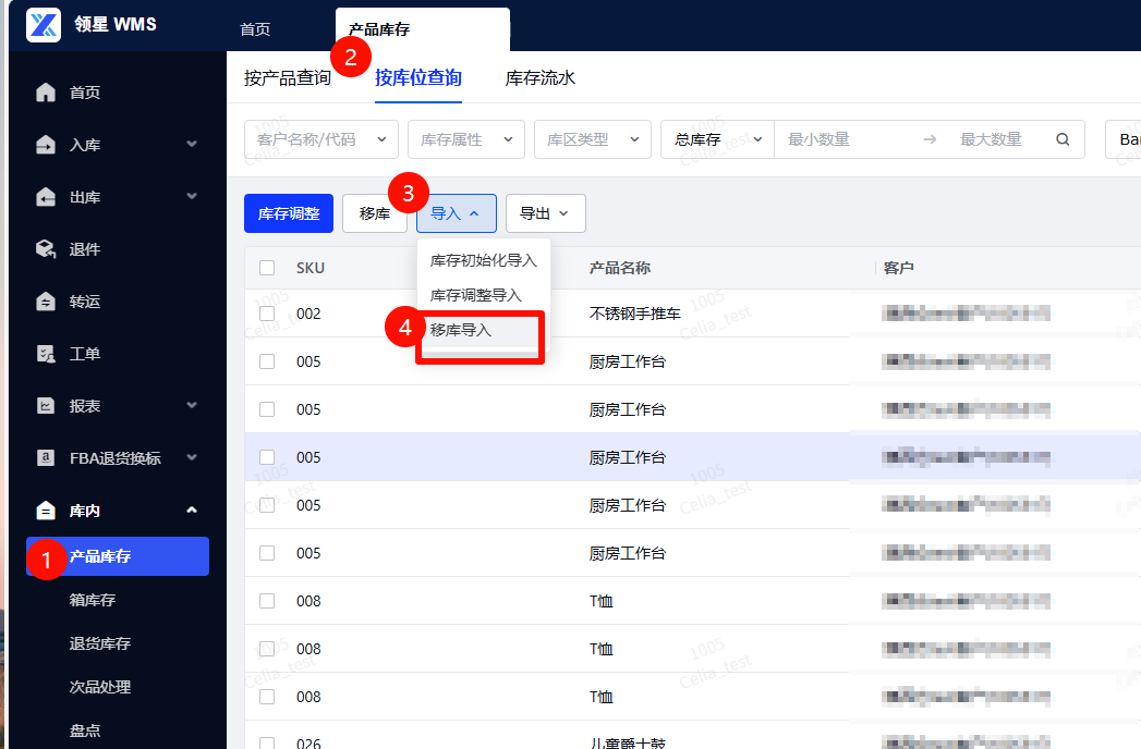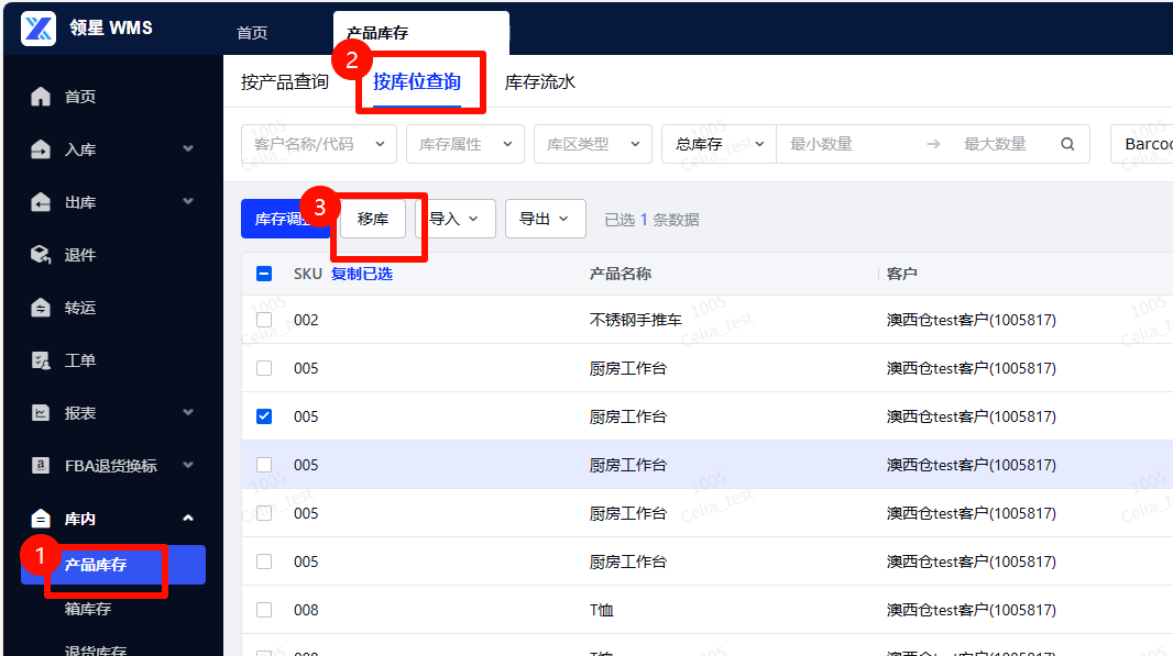 路径:【库内】-【产品库存】-【按库位查询】-【移库】第一步:选择要调整库位的SKU,点击【移库】按钮