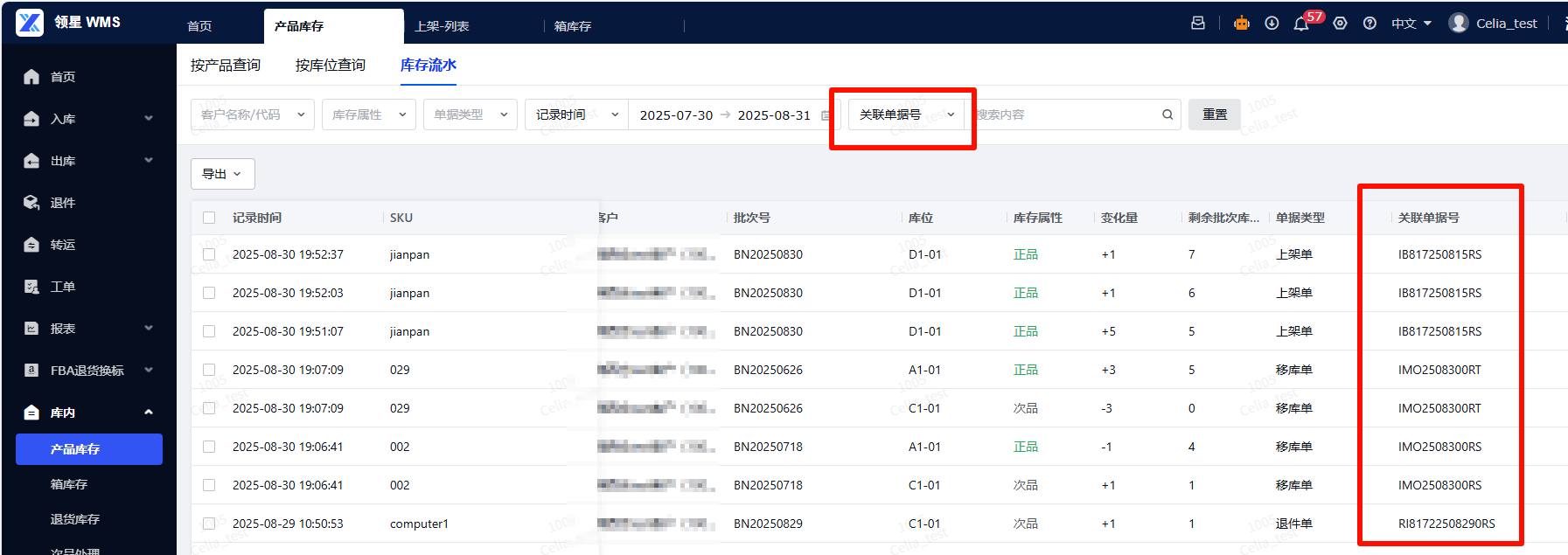 - 与该流水相关联的单据号,如上架时的“上架单号”、“入库单号”;出库时的“出库单号”,均可通过“关联单据号”搜索到相关流水。