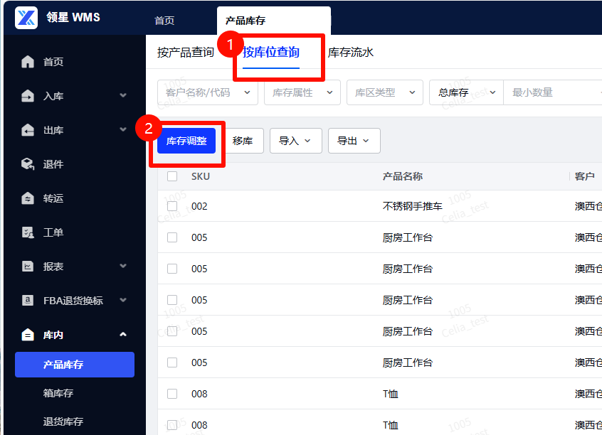 路径:【按库位查询】-【库存调整】第一步:选择要调整库位的SKU,点击【库存调整】按钮