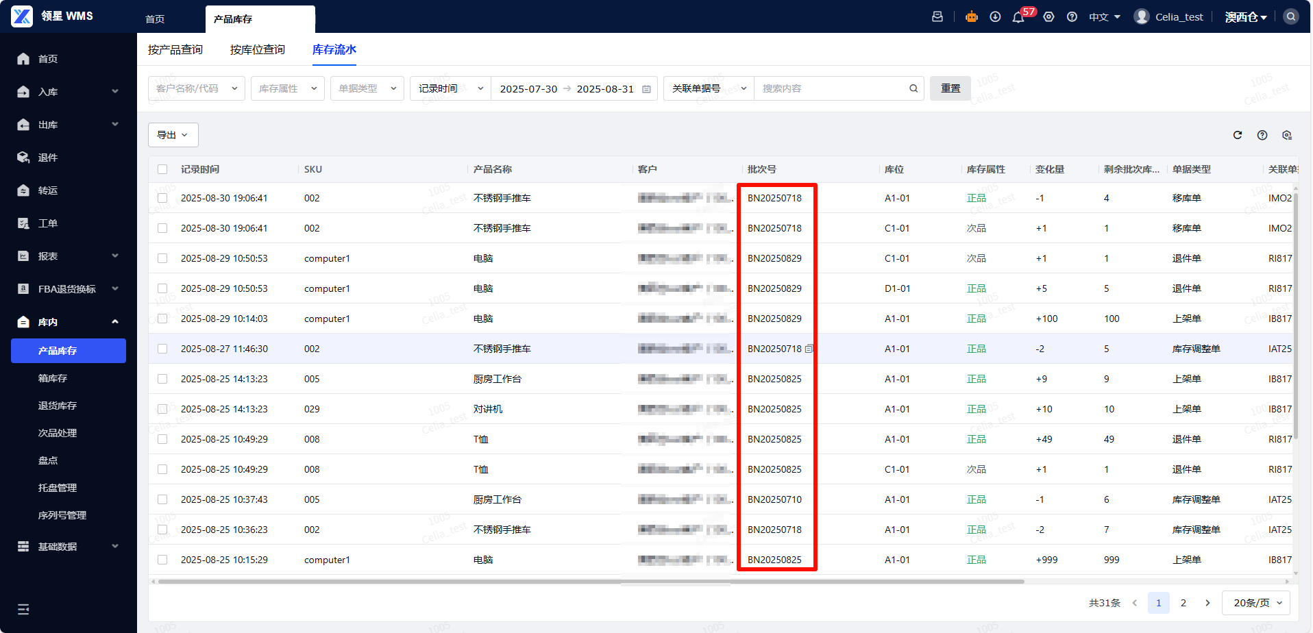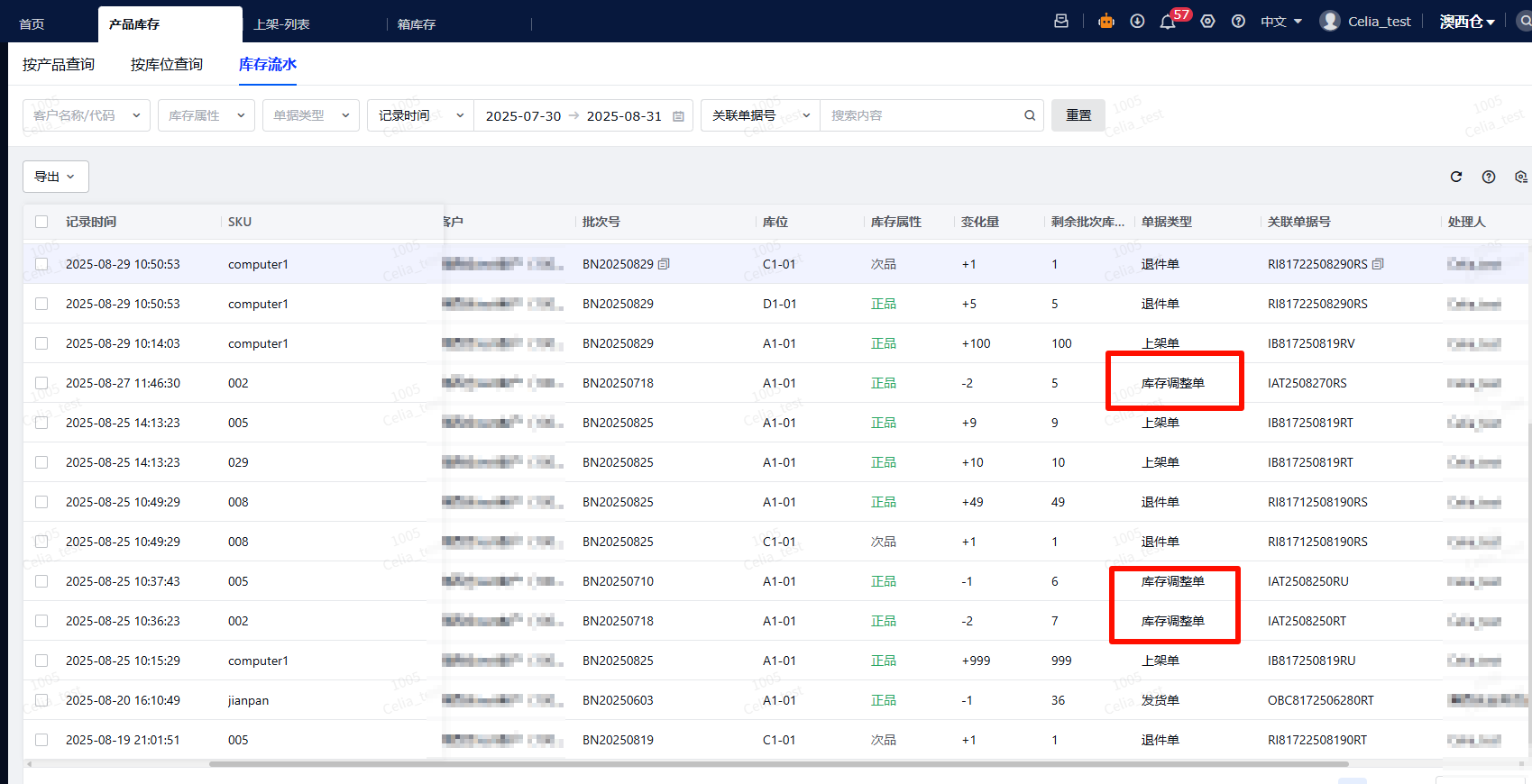 - 做过库存调整后产生的流水,关联单据类型显示为“库存调整单”。