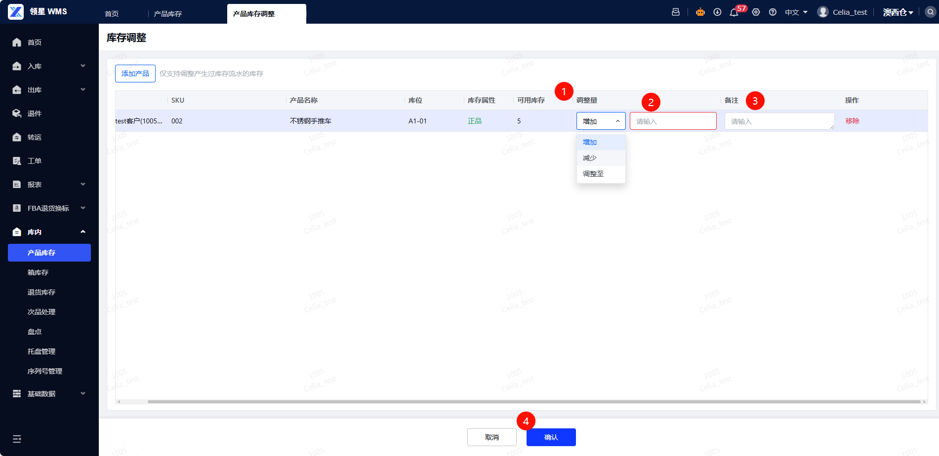 第二步:可选三种调整方式(增加、减少、调整至),输入调整数量、备注(非必填),【确认】即可。