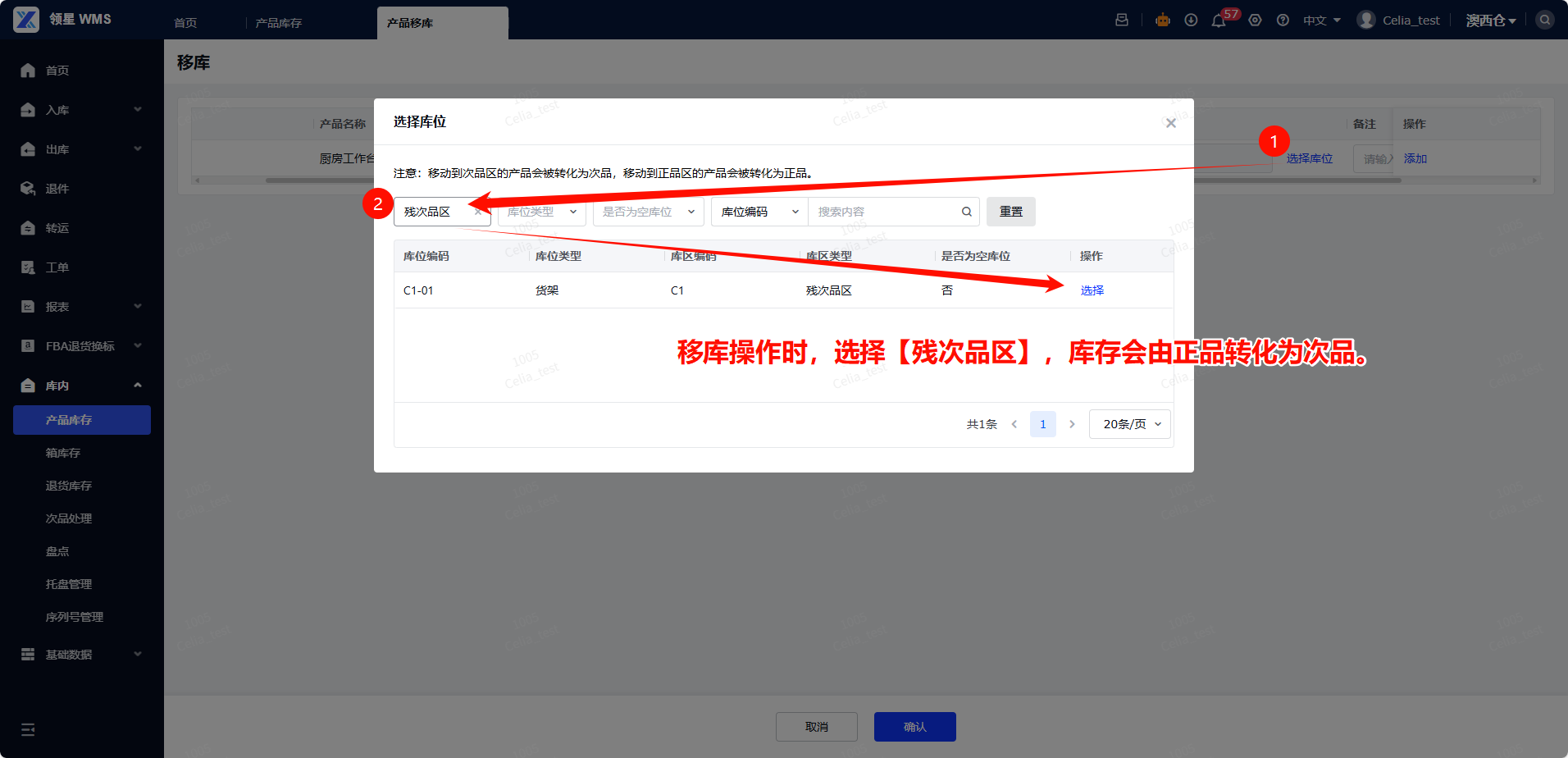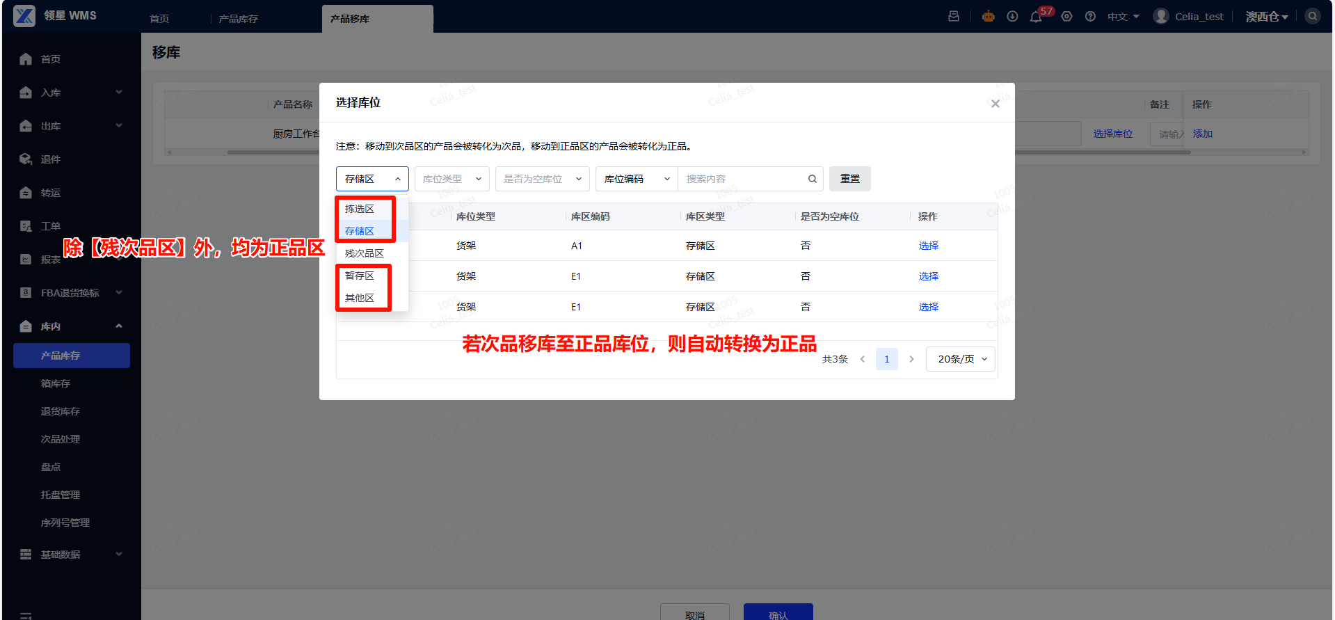 当入库或库内作业发现有商品损坏时,需要将这些商品库存转为次品;当商品进行返修会其他操作后,也需要将商品转为正品。这里涉及到两个功能:正品转次、次品转正。*注意:当前系统仅【产品库存】和【退货库存】支持正次转换,箱库存目前没有正次品的区分,不能做正次转换。*移动到次品区的产品会被转化为次品,移动到正品区的产品会被转化为正品。路径:【库内】-【产品库存】-【按库位查询】-【移库】