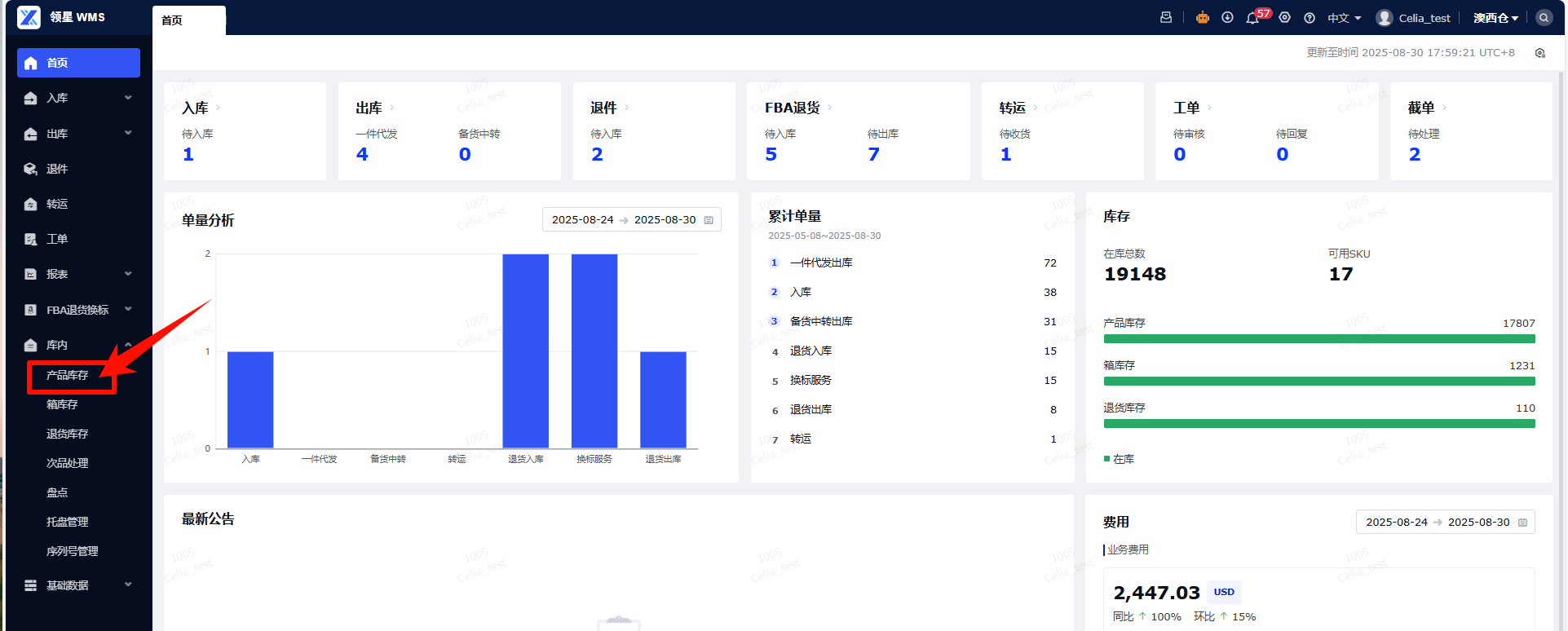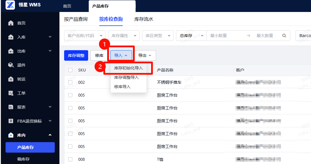 (1)进入WMS系统: 登录您的WMS仓库端,导航至库内-产品库存菜单。