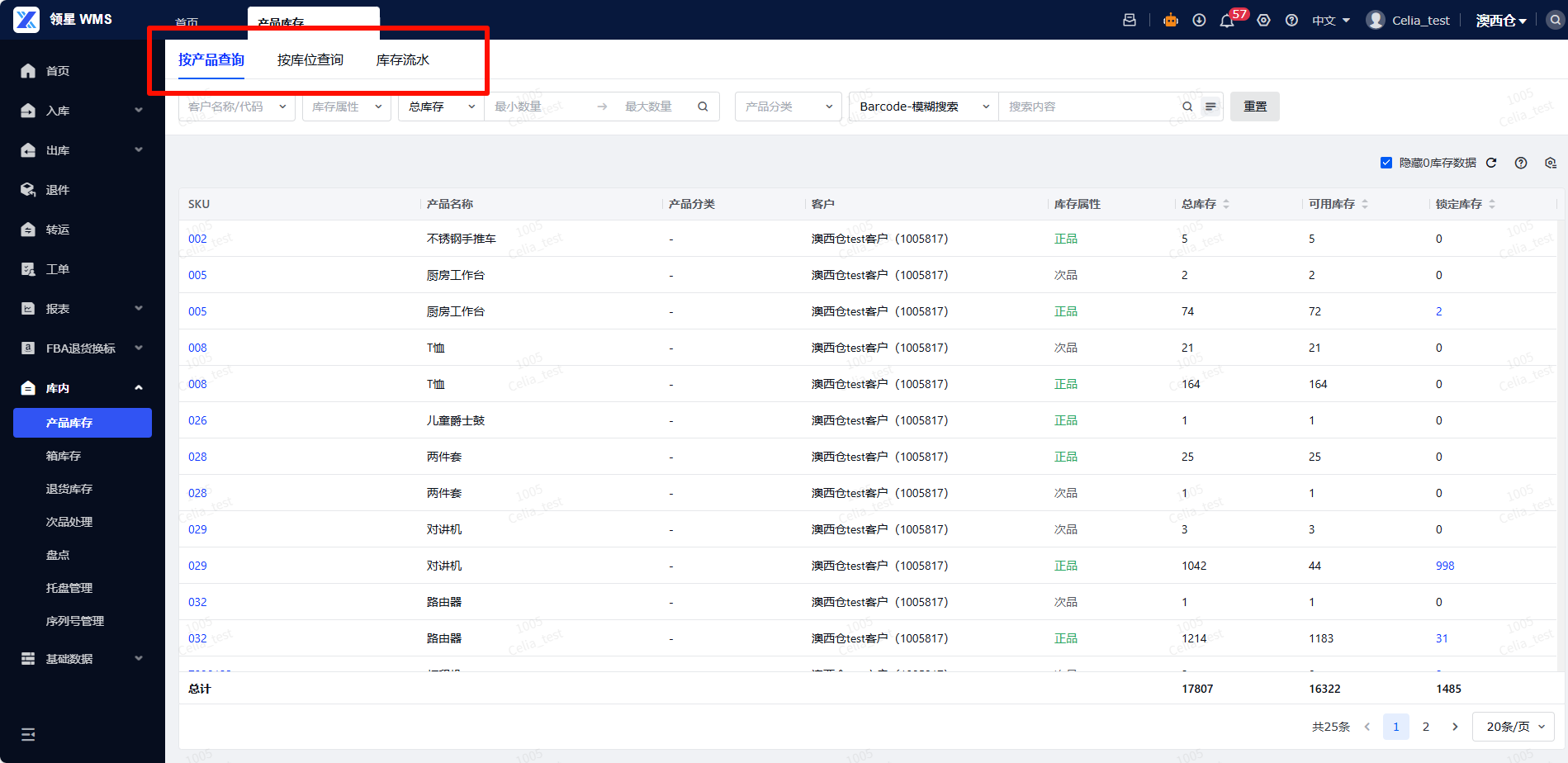 (2)产品库存分为三个板块,分别为【按产品查询】库存、【按库位查询】库存和【库存流水】查询。