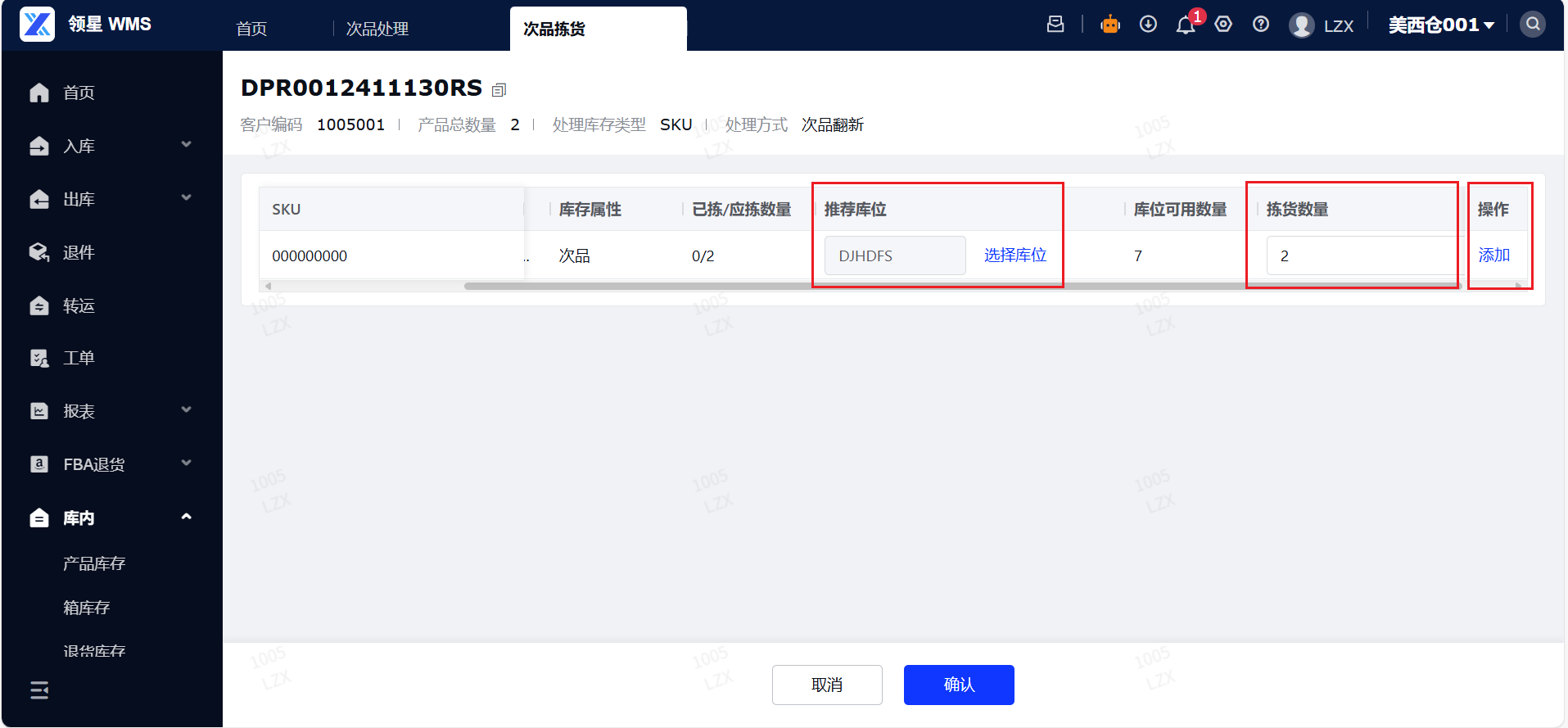 (5)次品处理单据进行拣货:定位到待拣货状态下,可以打印拣货单并拣货。拣货中对推荐库位、拣货数量进行更改,以及添加多个拣货库位。